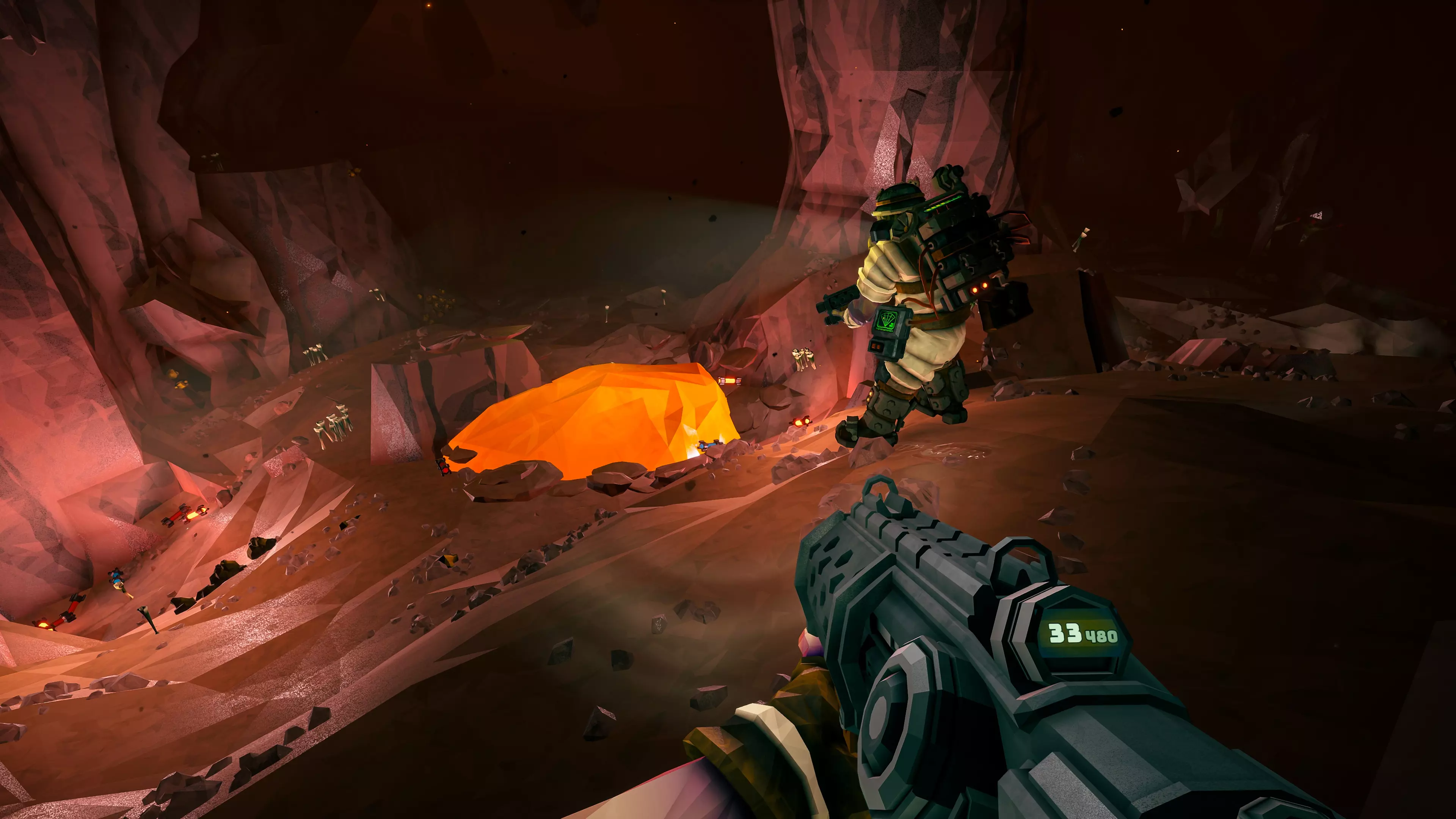 沿着欧西姆碎片留下的明显踪迹追踪,穿过它那迷宫般的隧道,你就能抵达它的巢穴。到达那里后,尽可能收集欧西姆并将其放入M.U.L.E.中以待提取。不过,你最好做好遭遇抵抗的准备——欧西兰人似乎对他们的欧西姆保护欲极强。