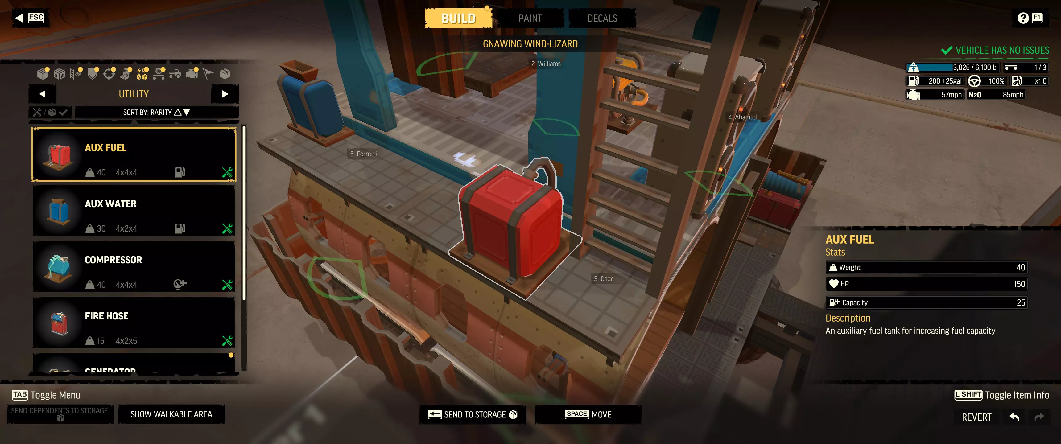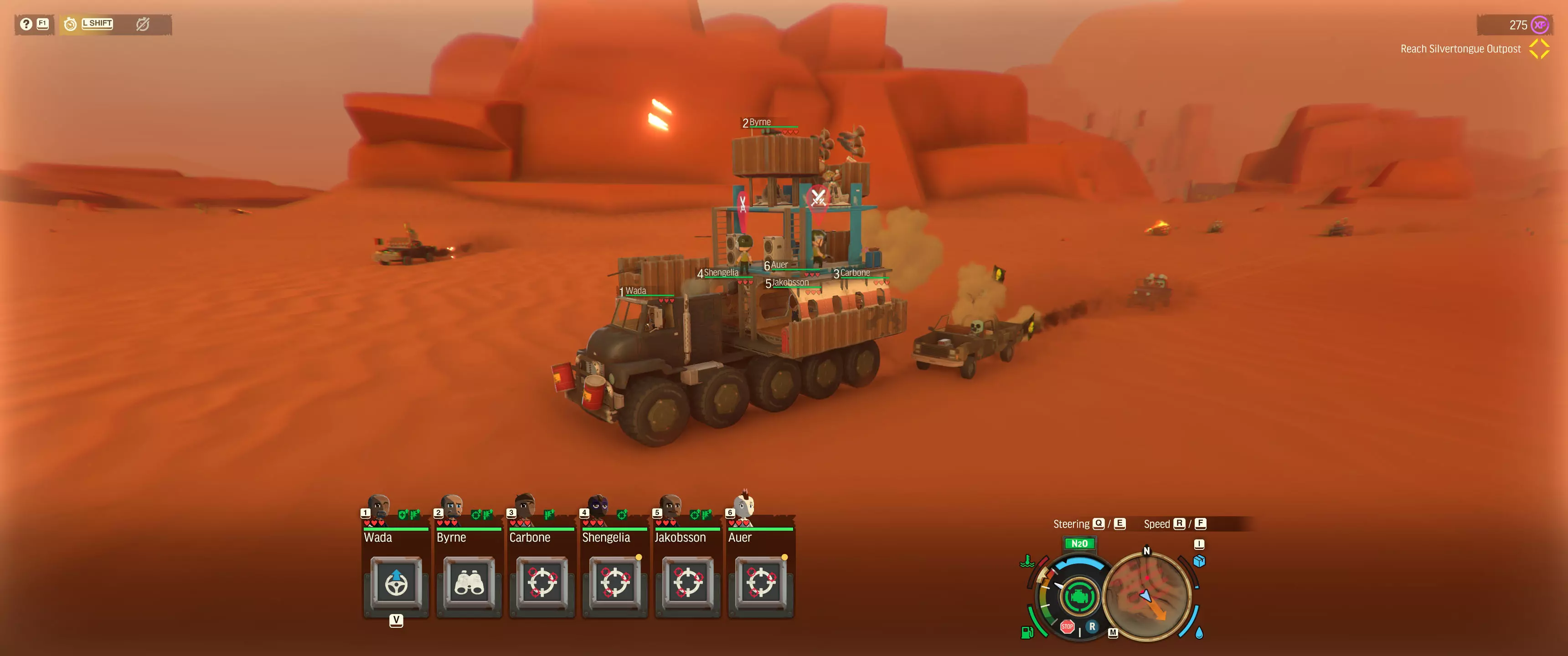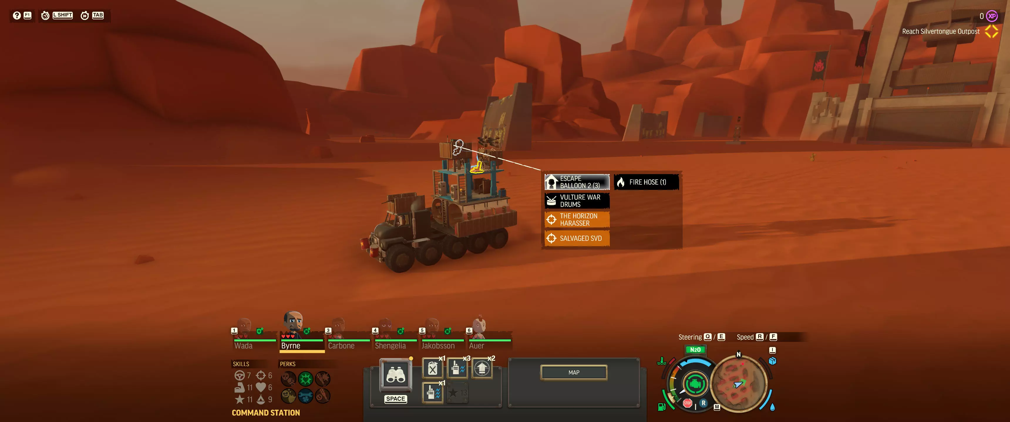 “时间减缓”快捷键(用户界面左上角) 别忘了使用“时间减缓”——它真的能为你争取拯救船员和战斗货车所需的时间。 **尽早升级载具的燃油容量** 在荒地中央耗尽燃油是最糟糕的情况。我建议你一解锁“辅助燃油箱”就立即为载具加装。随着游戏进程推进,当你有能力时,建议再多加装几个!
