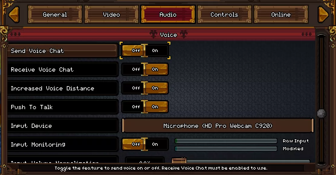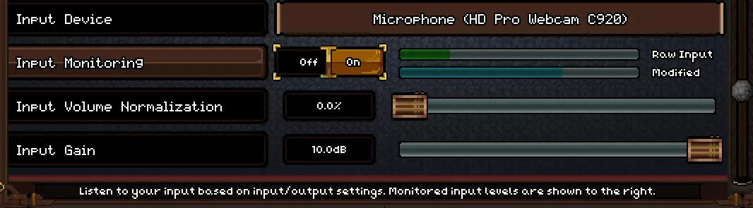 启用输入监听以监测你的音量水平 监听音量时,其基于“音量”部分中设置的游戏音量(主音量和语音滑块)。这反映了你和其他玩家在游戏中的实际听感。 当此设置处于激活状态且你当前在“音频”选项卡中时,若你在游戏中,对其他玩家的语音活动将暂停。 保持此设置启用并离开“音频”选项卡会停止监听,但重新进入“音频”选项卡时将恢复监听。 右侧的两个条形图可视化了你的当前音频水平: - **原始输入**:电脑报告的音量水平 - **已调整**:经过“输入音量标准化”和“输入增益”这两个选项处理后的音量水平