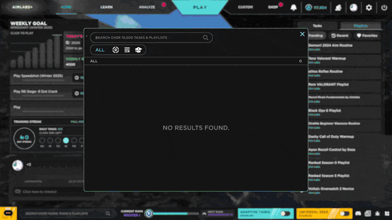 《Aimlabs》更新内容 **智能搜索功能上线** Aimlabs 内的搜索功能终于正常工作了!无需再尝试大量不同关键词却始终找不到所需任务。 现在,你可以在 Aimlabs 的任意界面按下 CTRL+F 打开智能搜索——这是一个全新升级的搜索系统,可帮助你找到所有任务、播放列表和训练计划,并为每类内容提供筛选功能! 目前智能搜索仅支持通过 CTRL+F 调用,但我们将尽快把它推广到 Aimlabs 的所有搜索栏中。立即体验并告诉我们你的想法!