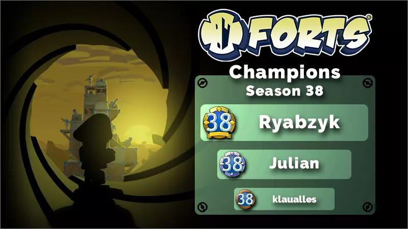 G'day《forts》的粉丝们! 恭喜Ryabzyk获得第38赛季冠军。Julian获得亚军,klaualles获得季军。前三名将分别获得金、银、铜牌,而所有排名前20的合格玩家都将获得第38赛季奖牌。同样恭喜所有获得奖牌的玩家! 1v1排行榜 1. Ryabzyk 2. Julian 3. klaualles 4. Dranistian 5. Poolboy 6. wIND 7. [HYP] Domy 8. I am myself 9. hhhhhhhhhhhh 10. bilibili_模组小白 11. Infinity 12. Александр 13. The Snake 14. Numenoror 15. BanaBanMan 16. BaumstaenderTTV 17. 木棉 18. kurama 19. Nils 20. tho15rider 排名统计 - **在高排名中,火束加迫击炮越来越成为打破僵局的首选方法。** - **Spook仍然是最受欢迎的指挥官,胜率保持不变。**- “飓风”“鹰眼”和“过载”的胜率提升最为显著,分别提高了5%、4%和4%。 - “幻影”本赛季的胜率大幅下降了整整8%。 - “电锯”是导致几乎所有3分钟内结束的对局以及大部分5分钟内结束对局的主要原因。