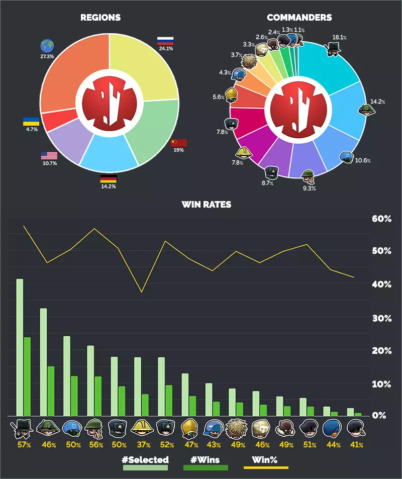 指挥官按人气顺序排列。Y轴显示胜率百分比,每个指挥官下方亦会显示该数值。 第39赛季 第39赛季已开启,将持续至1月31日。本赛季的地图池包含以下战场: - Balls - Battlegrounds 1v1 - Crevice - Stalactites 1v1 - Elephants - Split 加入我们的Discord! 如果您尚未加入,请加入我们的Forts官方Discord服务器,与其他玩家交流、分享策略、创建地图/模组,并提前获取即将到来的活动通知。 此致, EWG