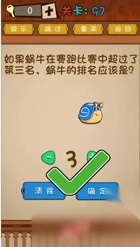 第97关: 如果蜗牛在赛跑比赛中超过了第三名,蜗牛的排名应该是? 答案:第三名