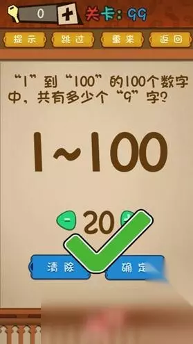 第98关: 我们单位有位同事叫袁健,你猜他儿子叫什么名字? 答案:“复印件” 第99关: “1”到“100”的100个数字中,共有多少个“9”字? 答案:20个~