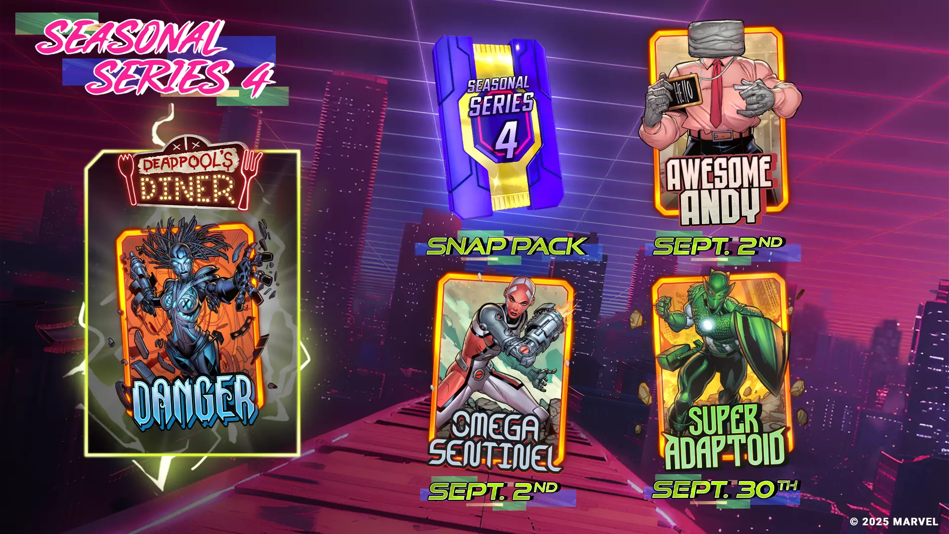 《漫威 Snap》全新卡包内容 - 9月2日:行星吞噬者 启程 - 赛季限定系列5 - 9月2日:银影侠 启程 - 赛季限定系列4 - 9月21日:空中行者 - 赛季限定系列4