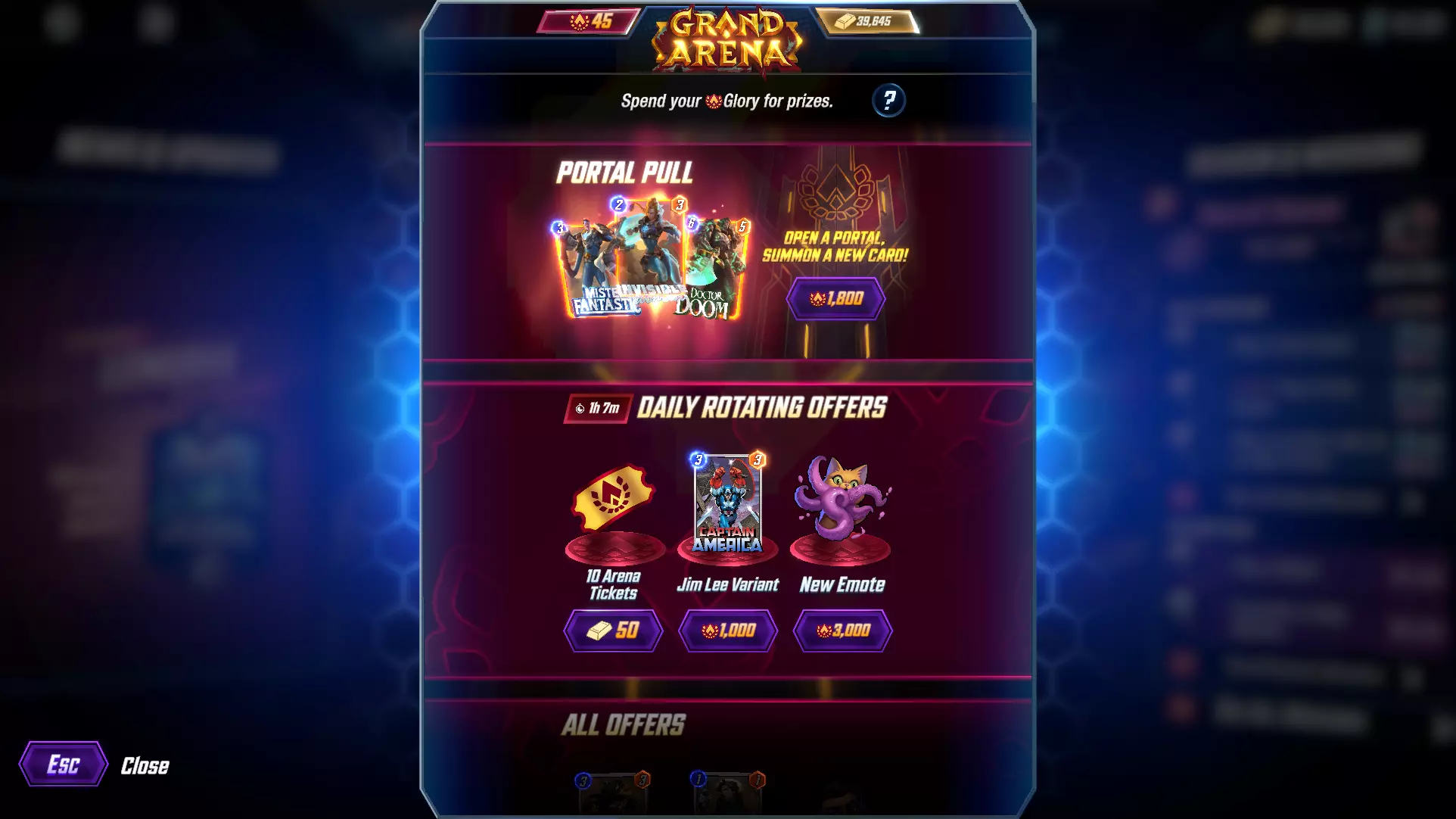 Battling your Champions in Grand Arena always leads to Glory and Event XP! Climb the ranks of the Arena Pass and claim a variety of rewards. Bring all the Glory you've earned to the Arena Shop and choose from a selection of prizes, including new Cards and Fantastic Cosmetics. Here are all the details: Rewards Per Match Win = 10 Glory + 10 XP + 1 Arena Ticket Loss = 5 Glory + 5 XP Tie = 5 Glory + 5 XP Arena Tickets Each match of Grand Arena requires one Ticket to enter. Every player will start with 8 tickets when the Grand Arena opens. Every 8 hours, 3 additional tickets will be added to your total up to the soft cap of 12. This means that if you have 12 Tickets, there will be no additional Tickets added every 8 hours. The timer for the 8 hour ticket reset starts on the first time you enter the Grand Arena. If for some reason you choose to test the limits of how many Tickets you can buy and hold at one time, you will be hard capped at 99. One match: One Arena Ticket Starting Tickets: 8 Tickets regeneration: 3 every 8 hours Ticket soft cap: 12 Ticket hard cap: 99 Cost per ticket: 10 Gold Introducing the Grand Arena Event Pass Reward Track! Grand Arena features an Event Pass with two reward tracks: Free and Premium. Progress on both tracks occurs simultaneously, serving as the main way to earn Glory, which you can spend in the Grand Arena Shop. Purchasing the Premium Pass significantly increases your rewards and accelerates your progression along the track. In addition to Glory, claiming rewards grants Event Pass XP. The only exclusive item available through the Premium Pass is "The Thing Clobberin' Time" Emote. The Premium Pass costs 1,200 Gold and can be purchased at any point during the active event. Event Pass Rewards and Levels [table equalcells="1" colwidth="60,61,231,41,227,51"][tr][th colwidth="60"] Level[/th][th colwidth="61"] XP[/th][th colwidth="231"] Free Event Pass Rewards[/th][th colwidth="41"] #[/th][th colwidth="227"] Premium Event Pass Rewards[/th][th colwidth="51"] #[/th][/tr][tr][td colwidth="60"] 1[/td][td colwidth="61"] 5[/td][td colwidth="231"] Mr Fantastic Boosters[/td][td colwidth="41"] 60[/td][td colwidth="227"] Glory + XP[/td][td colwidth="51"] 500[/td][/tr][tr][td colwidth="60"] 2[/td][td colwidth="61"] 25[/td][td colwidth="231"] Tickets[/td][td colwidth="41"] 2[/td][td colwidth="227"] Tokens[/td][td colwidth="51"] 25[/td][/tr][tr][td colwidth="60"] 3[/td][td colwidth="61"] 50[/td][td colwidth="231"] Credits[/td][td colwidth="41"] 25[/td][td colwidth="227"] Mr Fantastic Boosters[/td][td colwidth="51"] 90[/td][/tr][tr][td colwidth="60"] 4[/td][td colwidth="61"] 75[/td][td colwidth="231"] Glory + XP[/td][td colwidth="41"] 100[/td][td colwidth="227"] Random Boosters[/td][td colwidth="51"] 60[/td][/tr][tr][td colwidth="60"] 5[/td][td colwidth="61"] 225[/td][td colwidth="231"] Random Boosters[/td][td colwidth="41"] 30[/td][td colwidth="227"] Credits[/td][td colwidth="51"] 25[/td][/tr][tr][td colwidth="60"] 6[/td][td colwidth="61"] 250[/td][td colwidth="231"] Tokens[/td][td colwidth="41"] 25[/td][td colwidth="227"] Tickets[/td][td colwidth="51"] 2[/td][/tr][tr][td colwidth="60"] 7[/td][td colwidth="61"] 275[/td][td colwidth="231"] Human Torch First Steps Boosters[/td][td colwidth="41"] 60[/td][td colwidth="227"] Glory + XP[/td][td colwidth="51"] 100[/td][/tr][tr][td colwidth="60"] 8[/td][td colwidth="61"] 300[/td][td colwidth="231"] Glory + XP[/td][td colwidth="41"] 100[/td][td colwidth="227"] Tokens[/td][td colwidth="51"] 25[/td][/tr][tr][td colwidth="60"] 9[/td][td colwidth="61"] 425[/td][td colwidth="231"] Credits[/td][td colwidth="41"] 25[/td][td colwidth="227"] Human Torch First Steps Boosters[/td][td colwidth="51"] 90[/td][/tr][tr][td colwidth="60"] 10[/td][td colwidth="61"] 450[/td][td colwidth="231"] Tickets[/td][td colwidth="41"] 2[/td][td colwidth="227"] Random Boosters[/td][td colwidth="51"] 60[/td][/tr][tr][td colwidth="60"] 11[/td][td colwidth="61"] 475[/td][td colwidth="231"] Random Boosters[/td][td colwidth="41"] 30[/td][td colwidth="227"] Credits[/td][td colwidth="51"] 25[/td][/tr][tr][td colwidth="60"] 12[/td][td colwidth="61"] 525[/td][td colwidth="231"] Tokens[/td][td colwidth="41"] 25[/td][td colwidth="227"] Tickets[/td][td colwidth="51"] 2[/td][/tr][tr][td colwidth="60"] 13[/td][td colwidth="61"] 600[/td][td colwidth="231"] The Thing First Steps Boosters[/td][td colwidth="41"] 60[/td][td colwidth="227"] Glory + XP[/td][td colwidth="51"] 100[/td][/tr][tr][td colwidth="60"] 14[/td][td colwidth="61"] 650[/td][td colwidth="231"] Glory + XP[/td][td colwidth="41"] 100[/td][td colwidth="227"] Tokens[/td][td colwidth="51"] 25[/td][/tr][tr][td colwidth="60"] 15[/td][td colwidth="61"] 775[/td][td colwidth="231"] Credits[/td][td colwidth="41"] 25[/td][td colwidth="227"] The Thing First Steps Boosters[/td][td colwidth="51"] 90[/td][/tr][tr][td colwidth="60"] 16[/td][td colwidth="61"] 825[/td][td colwidth="231"] Tickets[/td][td colwidth="41"] 2[/td][td colwidth="227"] Random Boosters[/td][td colwidth="51"] 60[/td][/tr][tr][td colwidth="60"] 17[/td][td colwidth="61"] 900[/td][td colwidth="231"] Random Boosters[/td][td colwidth="41"] 30[/td][td colwidth="227"] Credits[/td][td colwidth="51"] 25[/td][/tr][tr][td colwidth="60"] 18[/td][td colwidth="61"] 975[/td][td colwidth="231"] Tokens[/td][td colwidth="41"] 25[/td][td colwidth="227"] Tickets[/td][td colwidth="51"] 2[/td][/tr][tr][td colwidth="60"] 19[/td][td colwidth="61"] 1,050[/td][td colwidth="231"] Invisible Woman Boosters[/td][td colwidth="41"] 60[/td][td colwidth="227"] Glory + XP[/td][td colwidth="51"] 200[/td][/tr][tr][td colwidth="60"] 20[/td][td colwidth="61"] 1,125[/td][td colwidth="231"] Glory + XP[/td][td colwidth="41"] 200[/td][td colwidth="227"] Tokens[/td][td colwidth="51"] 25[/td][/tr][tr][td colwidth="60"] 21[/td][td colwidth="61"] 1,250[/td][td colwidth="231"] Credits[/td][td colwidth="41"] 25[/td][td colwidth="227"] Invisible Woman Boosters[/td][td colwidth="51"] 90[/td][/tr][tr][td colwidth="6