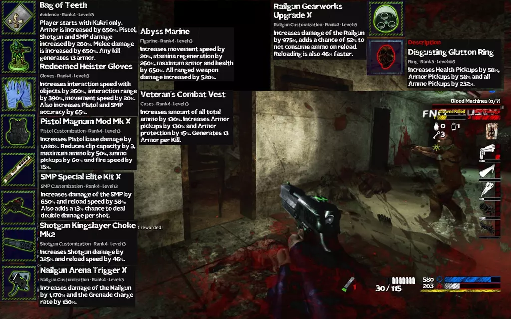 Stats Damage Pistol = 260 + 1020 + 520 = 1800% SMP = 260 + 650 + 520 = 1430% Shotgun = 260 + 325 + 520 = 1105% Nailgun = 1170 + 520 = 1690% Railgun = 975 + 520 = 1495% Melee = 650% Reload Speed Pistol = -25% SMP = 58% Shotgun = 46% Railgun = 75% Ghost Reload Railgun = 52% Ammo Pickups Pistol = 420 - 60 = 360% other = 420% Ammo Capacity Pistol = 130 - 50 = 80% Other weapons = 130% Defense Max Health = 100 + 650 = 750 Max Armor = 50 + (50*1300)/100 = 700 Armor Protection = 25 + 15 = 40% Defense Pickups Armor Pickups = 130 + 105 = 235% Health Pickups = 105% Other Movement Speed = 20 + 20 = 40% Life Leech = 0 Armor Regeneration Per Kill = 26 Intaract Speed = 260% Intaract Range = 390% Stamina Regenation = 260% Pistol & SMP Accuracy = 65% Comments 改めて数字を並べて観察してもやっぱ穴が少ないなぁと思う PickupはRingのみでほぼすべてまかない、あとは装備で火力を出す構成。Heister Gloveを上手く使おうと思うならこの上ない仕上がりのように見える。初期武器は何を拾うかで左右されるが特にMagnumの能力が威力1800%確保しつつ360%回収できるのが強み、回収率のおかげでいつもどんな武器でも大盤振る舞いで撃ちまくることができる。継戦能力に関してはピカイチでいろんなChallengeにも対応しやすい 以下本人談 引用自 zod:basically it's very safe, with all the armor regeneration also the interaction speed / range from the gloves is very nice once you start using it it's really hard to start using something else the one disadvantage would be a rather low armor protection but that is more or less negated by the high armor regen glutton ring is so good, it was the final piece to really complete my build the ammo pick up is such a convenience before I started using Glutton ring I often died from lack of ammo the fact that you start without a weapon can sometimes be difficult if you run into a lot of monsters before you find a gun also when joining a game it can be very hard since most weapons are already taken and usually there are lots of monsters around やはり弾薬不足で死んだ経験からこのリングのチョイスに至った、とのこと わかる、わかるぞ…同じ過ちをしたからな! そして硬さの面では若干不満がある模様、Defense面ではArmorPickupがこれくらいだと小さいアーマーで60前後くらいしか回復しないのでキルを取っていくことで回復させるほうが手っ取り早いという感じがする、RingはGlutton Ringに変更するのもいいかも(210%,210%,210%) それとククリスタートの弱点として途中参加に非常に弱い点を注意している 特に硬さの面では上記の弱点があるため銃をすでに取られてしまったところに入るとなかなか軌道に乗るまでが難しいという点を伝えたいようだ 次に40%の移動速度に関しては(制御しにくくない?って聞いてみた) 引用自 zod:actually it was a bit hard at first it's quite fast but after a while you get used to it and now everything else feels slow it's really nice for dodging and scouting the map as wellと言ってるんで慣れれば大丈夫だ、って感じみたい 20%でも自分には速すぎて扉に入りそびれるなんてことがあるぜ 使ってる本人に聞いてみるといろいろ難点もあるようだが 傍から見てるとやはりバランスは良いと思う Build例紹介 Rusty's Build