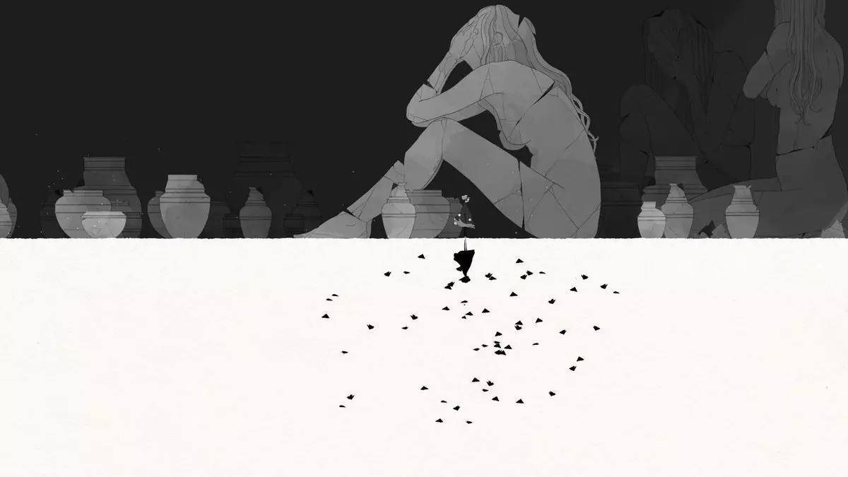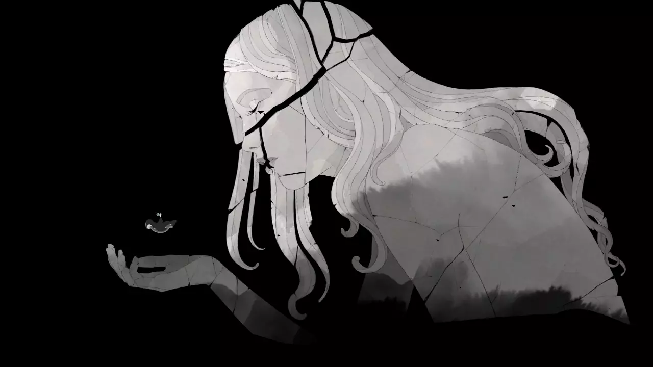 观看过这段过场动画后,玩家会获得成就“Детство”。有人认为这表明在游戏进程中,格里斯已经成年。我完全理解这种可能性,但这对我来说没有任何影响,因为对于父母(尤其是充满爱意的母亲)而言,孩子永远是孩子,永远那么小,那么脆弱。 我个人更倾向于认为,格里斯一直停留在童年,永远如此。因此我推测,这是母亲关于女儿的最后一段鲜明记忆。 不过让我们从头说起。 游戏从格里斯在母亲雕像的手掌上醒来开始。这只手掌布满了裂痕,整座雕像亦是如此——母亲的灵魂因她心爱的女儿而痛苦——“心碎欲裂”。