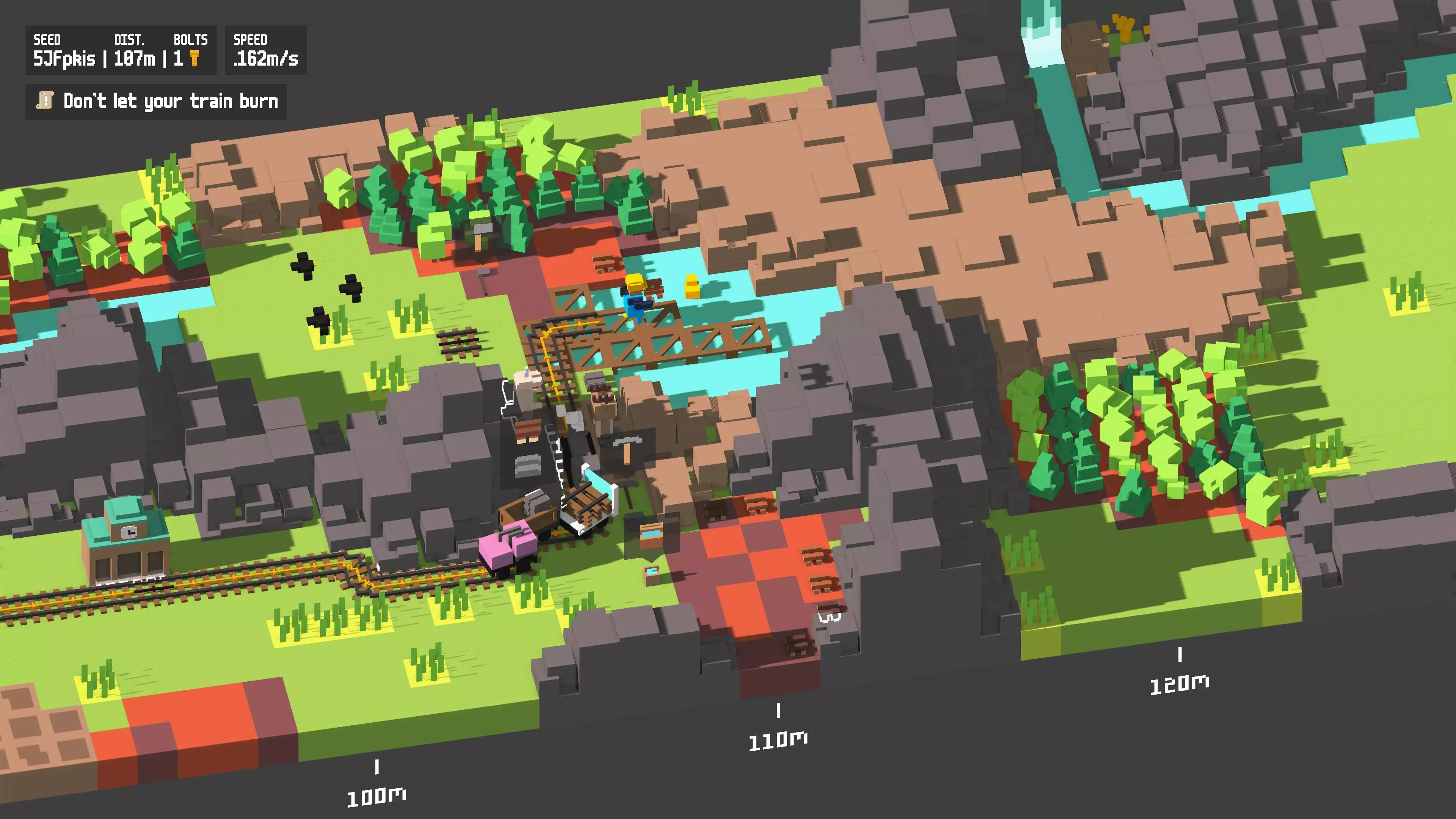 第一个生物群系“平原”较为基础,挑战较少。首先,雨水会为马车降温并注满水桶,这让取水不再麻烦,早期也就无需在水上花费螺栓了。你将面临两个障碍:一是会偷材料的土匪,二是需要搭建桥梁的河流——当看到桥梁轮廓时,手持木材并将其放置在水面上即可。夜晚会使屏幕变暗,能见度仅局限于玩家和火车头周围,导致难以看清前方道路。
