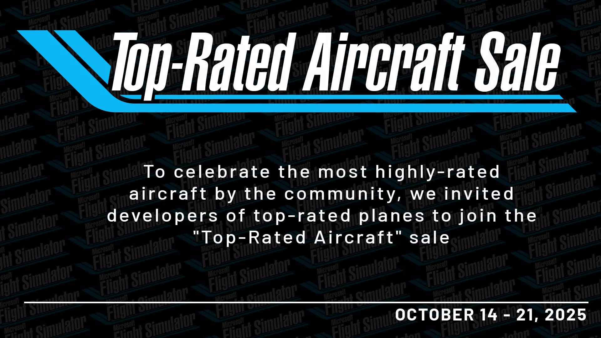 Enjoy discounted pricing during our Top-Rated Aircraft Sale! For 7 Days starting on October 14th, save up to 69% on the following items: [table equalcells="1" colwidth=","][tr][th] Developer[/th][th] Product[/th][/tr][tr][td] //42[/td][td] Fox2 Base[/td][/tr][tr][td] //42[/td][td] FreedomFox/Fox2 – Complete Pack[/td][/tr][tr][td] A2A Simulations Inc.[/td][td] Comanche 250[/td][/tr][tr][td] Aeroplane Heaven[/td][td] Avro Lancaster Bmk1[/td][/tr][tr][td] Aerosoft[/td][td] CRJ[/td][/tr][tr][td] Ant’s Airplanes[/td][td] Drifter A-582[/td][/tr][tr][td] Ant’s Airplanes[/td][td] Tiger Moth[/td][/tr][tr][td] Ant’s Airplanes[/td][td] Winjeel[/td][/tr][tr][td] Azurpoly[/td][td] Fouga CM-170 Magister[/td][/tr][tr][td] AzurPoly[/td][td] OV-10 Bronco[/td][/tr][tr][td] AzurPoly[/td][td] TB30 Epsilon[/td][/tr][tr][td] AzurPoly[/td][td] Transall C160[/td][/tr][tr][td] Big Radials[/td][td] JRF-6 Goose[/td][/tr][tr][td] Black Square[/td][td] Piston Duke[/td][/tr][tr][td] Black Square[/td][td] TBM 850[/td][/tr][tr][td] Black Square[/td][td] Turbine Duke[/td][/tr][tr][td] Blackbird Simulations[/td][td] 310R[/td][/tr][tr][td] Blackbird Simulations[/td][td] A6M5 Zero[/td][/tr][tr][td] Blackbird Simulations[/td][td] FG-1D Corsair[/td][/tr][tr][td] Blackbird Simulations[/td][td] PC-6 Porter[/td][/tr][tr][td] Carenado[/td][td] B55[/td][/tr][tr][td] Carenado[/td][td] C170B[/td][/tr][tr][td] Carenado[/td][td] C182 RG II[/td][/tr][tr][td] Carenado[/td][td] F33A[/td][/tr][tr][td] Carenado[/td][td] PA28 181 Archer II[/td][/tr][tr][td] Carenado[/td][td] PA34T Seneca V[/td][/tr][tr][td] Carenado[/td][td] WYMF5[/td][/tr][tr][td] CJSimulations[/td][td] CJS R-Fal[/td][/tr][tr][td] CJSimulations[/td][td] Eurofighter Typhoon[/td][/tr][tr][td] Classic Aircraft Simulations[/td][td] Piper Cub J3C-65[/td][/tr][tr][td] Classics Hangar[/td][td] Klemm Kl 25 d VII R[/td][/tr][tr][td] Cowan Simulation[/td][td] CS 206L3[/td][/tr][tr][td] Cowan Simulation[/td][td] CS 500E[/td][/tr][tr][td] Cowan Simulation[/td][td] CS H125/AS350B3e[/td][/tr][tr][td] Cowan Simulation[/td][td] CS R22[/td][/tr][tr][td] Cowan Simulation[/td][td] CS R66[/td][/tr][tr][td] COWS[/td][td] DA40 Series[/td][/tr][tr][td] COWS[/td][td] DA42 Series[/td][/tr][tr][td] Dassault / AzurPoly / JFEXP[/td][td] Jaguar[/td][/tr][tr][td] DC Designs[/td][td] AV-8B Harrier II[/td][/tr][tr][td] DC Designs[/td][td] Concorde[/td][/tr][tr][td] DC Designs[/td][td] F-14 A/B/D Tomcats[/td][/tr][tr][td] DC Designs[/td][td] Stearman Model 75[/td][/tr][tr][td] DC Designs[/td][td] SU-27 Flanker[/td][/tr][tr][td] F7 Simulations[/td][td] Eagle S100[/td][/tr][tr][td] Flight Replicas[/td][td] DH60 Gipsy Moth[/td][/tr][tr][td] FlightFX[/td][td] Cirrus Vision Jet G2[/td][/tr][tr][td] FlightFX[/td][td] P180[/td][/tr][tr][td] FlyBoySim[/td][td] Rans S6S Coyote II[/td][/tr][tr][td] Flying Fries[/td][td] XF-11[/td][/tr][tr][td] FlyingIron Sims[/td][td] F6F-5 Hellcat[/td][/tr][tr][td] FlyingIron Sims[/td][td] Fw 190 A-8[/td][/tr][tr][td] FlyingIron Sims[/td][td] P-38L Lightning[/td][/tr][tr][td] FlyingIron Sims[/td][td] Spitfire LF Mk IXc[/td][/tr][tr][td] Flysimware[/td][td] C414AW Chancellor[/td][/tr][tr][td] Flysimware[/td][td] Nieuport-24[/td][/tr][tr][td] FSReborn[/td][td] FSR500[/td][/tr][tr][td] FSReborn[/td][td] TL-Ultralight Sirius TL3000[/td][/tr][tr][td] FSReborn[/td][td] TL-Ultralight Sting S4[/td][/tr][tr][td] GKS[/td][td] F-111E[/td][/tr][tr][td] Got Friends[/td][td] AS 33 ME[/td][/tr][tr][td] Got Friends[/td][td] Astro ONE[/td][/tr][tr][td] Got Friends[/td][td] Discus-2c[/td][/tr][tr][td] Got Friends[/td][td] DoubleEnder[/td][/tr][tr][td] Got Friends[/td][td] F4F-4 Wildcat[/td][/tr][tr][td] Got Friends[/td][td] Gee Bee R3 Special[/td][/tr][tr][td] Got Friends[/td][td] Legacy Collection[/td][/tr][tr][td] Got Friends[/td][td] Mini-500[/td][/tr][tr][td] Got Friends[/td][td] Wilga 35/80 Series[/td][/tr][tr][td] Hangar Studios 713[/td][td] Camair 480 Twin Navion[/td][/tr][tr][td] Hangar Studios 713[/td][td] Super Decathlon[/td][/tr][tr][td] Heatblur-IndiaFoxtEcho[/td][td] F-14 Tomcat[/td][/tr][tr][td] Heaven Designs & Giba[/td][td] HVN4B GLOBAL HAWK[/td][/tr][tr][td] IndiaFoxtEcho[/td][td] F-35 Lightning II[/td][/tr][tr][td] IndiaFoxtEcho[/td][td] Leonardo M-346 Master[/td][/tr][tr][td] IndiaFoxtEcho[/td][td] MB-339A/MB-339PAN[/td][/tr][tr][td] IndiaFoxtEcho[/td][td] T-45C Goshawk[/td][/tr][tr][td] IndiaFoxtEcho[/td][td] Tornado[/td][/tr][tr][td] iniBuilds[/td][td] BF-108[/td][/tr][tr][td] iniBuilds[/td][td] P-40F Warhawk[/td][/tr][tr][td] Just Flight[/td][td] 146 Professional[/td][/tr][tr][td] Just Flight[/td][td] F28 Professional[/td][/tr][tr][td] Just Flight[/td][td] PA28 Arrow Bundle[/td][/tr][tr][td] Just Flight[/td][td] PA28 Arrow III[/td][/tr][tr][td] Just Flight[/td][td] PA28 Turbo Arrow III/IV[/td][/tr][tr][td] Just Flight[/td][td] PA-38 Tomahawk[/td][/tr][tr][td] Just Flight[/td][td] RJ Professional[/td][/tr][tr][td] Just Flight[/td][td] Vulcan B Mk. 2, K.2 & MRR[/td][/tr][tr][td] Lionheart Creations[/td][td] LHC Bucker Bu131 Jungmann[/td][/tr][tr][td] Lionheart Creations[/td][td] LHC Pasped Skylark[/td][/tr][tr][td] Lionheart Creations[/td][td] LHC Wittman Tailwind Bush Plane[/td][/tr][tr][td] Lionheart Creations[/td][td] LHC Wittman Tailwind Series[/td][/tr][tr][td] LivToAir[/td][td] Edge 540 V2[/td][/tr][tr][td] LivToAir[/td][td] Eviation Alice Full Electric[/td][/tr][tr][td] Mario Noriega Designs[/td][td] C-22J Ventura[/td][/tr][tr][td] Mario Noriega Designs[/td][td] Nardi FN-333 Riviera[/td][/tr][tr][td] Miltech Simulations[/td][td] CH47D[/td][/tr][tr][td] Miltech Simulations[/td][td] M2K-C[/td][/tr][tr][td] Miltech Simulations[/td][td] MH60[/td][/tr][tr][td] Mscenery[/td][td] 747SCA Professional[/td][/tr][tr][td] Mscenery[/td][td] A319neo Professional[/td][/tr][tr][td] Nemeth Designs[/td][td] Hiller UH-12B[/td][/tr][tr][td] PMDG Simulations[/td][td] 737-700[/td][/tr][tr][td] PMDG Simulations[/td][td] 737-800[/td][/tr][tr][td] PMDG Simulations[/td][td] PMDG 777-200ER