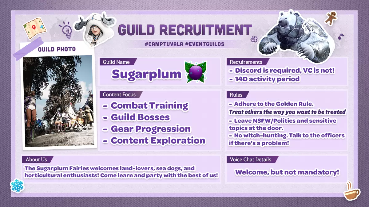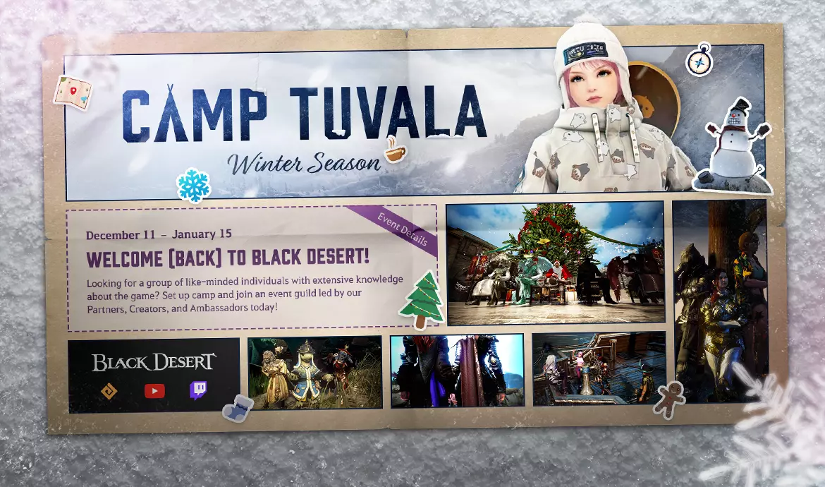 [公会活动] 前往图瓦拉营地的路! ヾ(^ ∇ ^). 欢迎(回归)《黑色沙漠》! 今年冬天,与最具经验的冒险家团队携手,开启全新的精彩旅程!加入由《黑色沙漠》合作伙伴、创作者及大使们领导的成长公会,在游戏进程中获得指导、支持与伙伴陪伴。 活动时间:12月11日(周四)- 1月15日(周四)