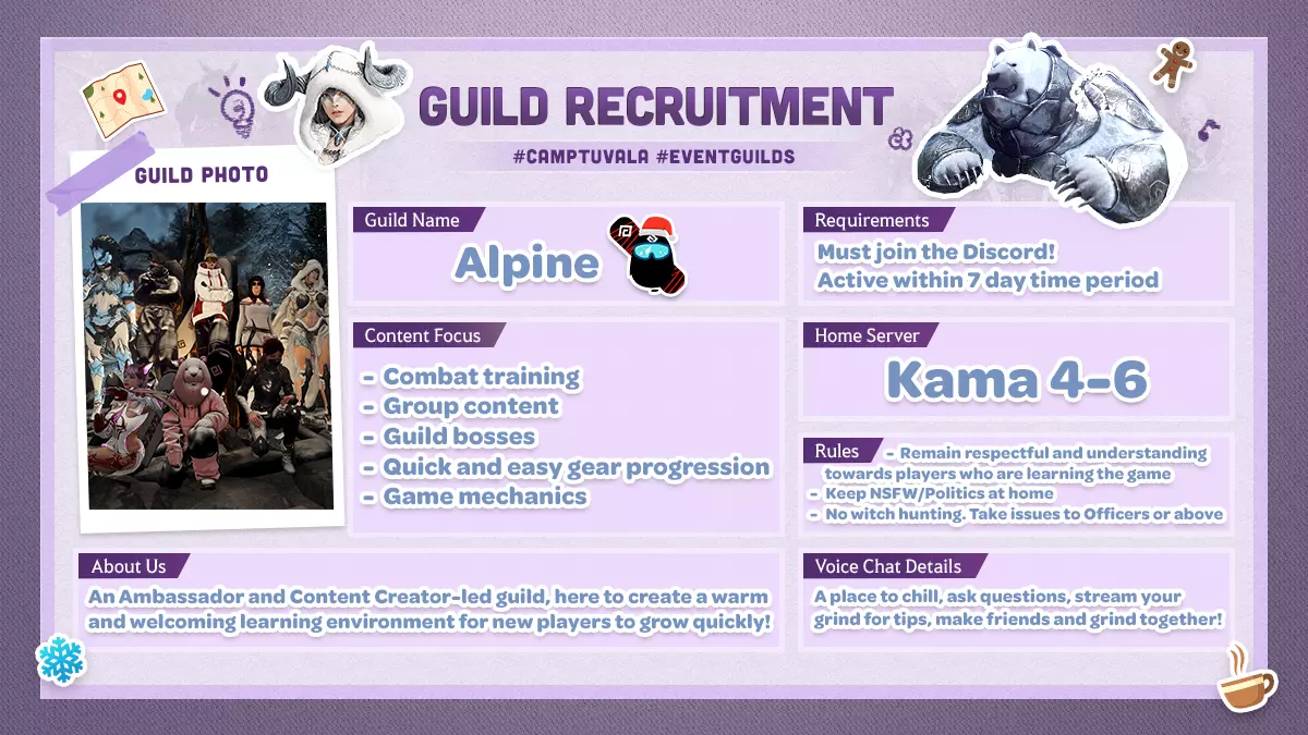各位冒险家,大家好! 无论你是勇敢地跟随玛尼穿过神秘传送门,还是在沉睡许久后刚刚苏醒,我们都非常荣幸地欢迎你来到图瓦拉营地以及《黑色沙漠》的世界! 这片土地广阔无垠,充满挑战。你不必独自踏上这段旅程!因此,我们创建了图瓦拉营地,新老冒险家都能在这里获得支持、友谊和一个友好的开端。由我们热情的合作伙伴、创作者和大使们领导的公会将为你提供成长所需的指导。 在图瓦拉营地,你将有机会加入一个对新手友好的公会,向《黑色沙漠》的资深老手学习,并参与团体活动。前方的道路充满神秘,你将与一个强大的社区并肩体验这一切! 你准备好开启下一场伟大的冒险了吗? 选择你的公会 [表格] [行] [表头][北美] ALPINE[/表头] [/行] [行] [单元格]