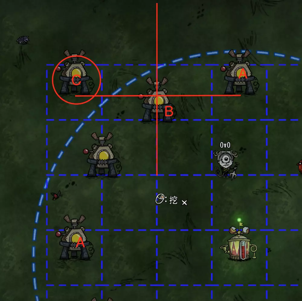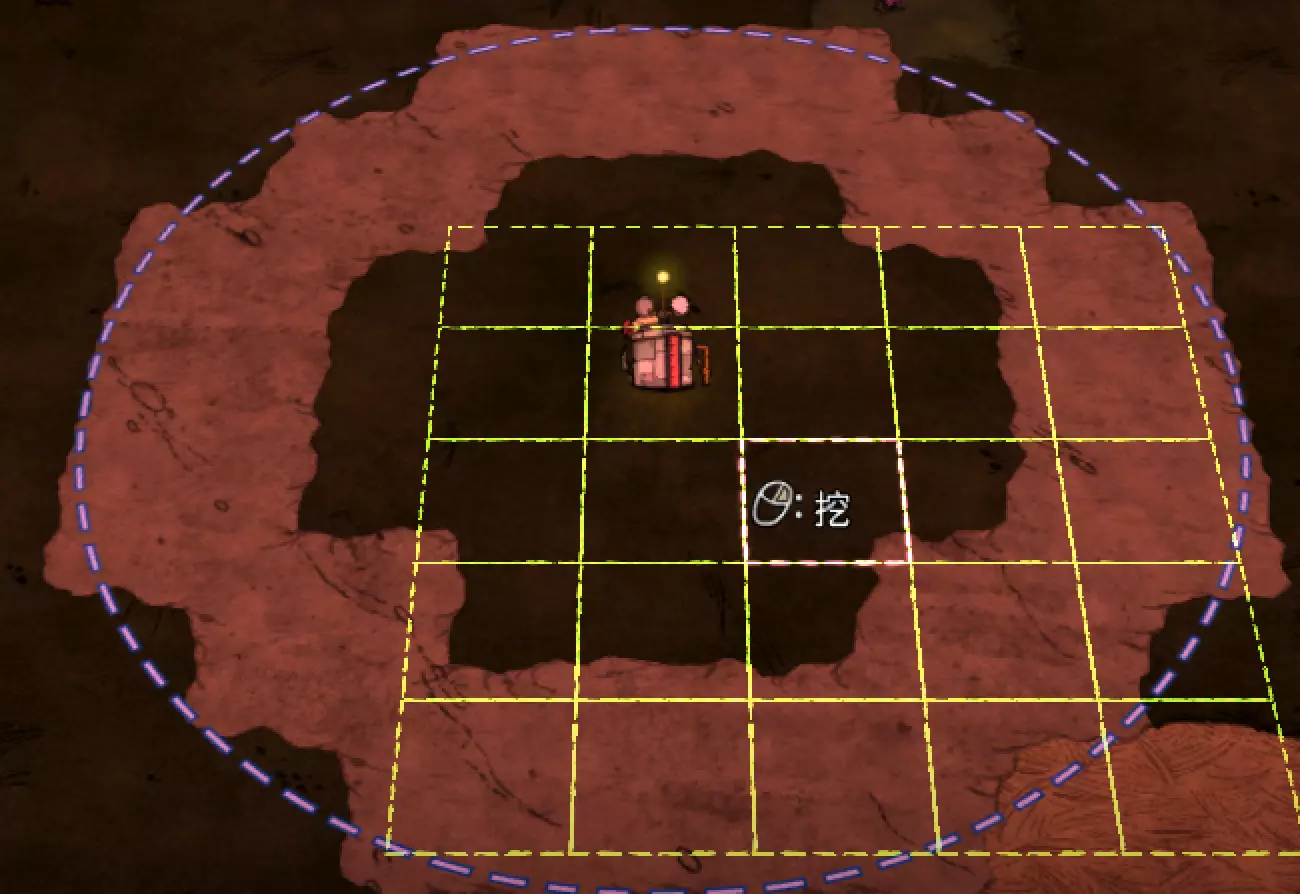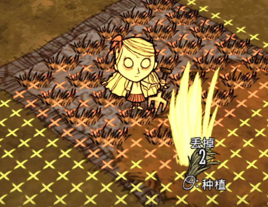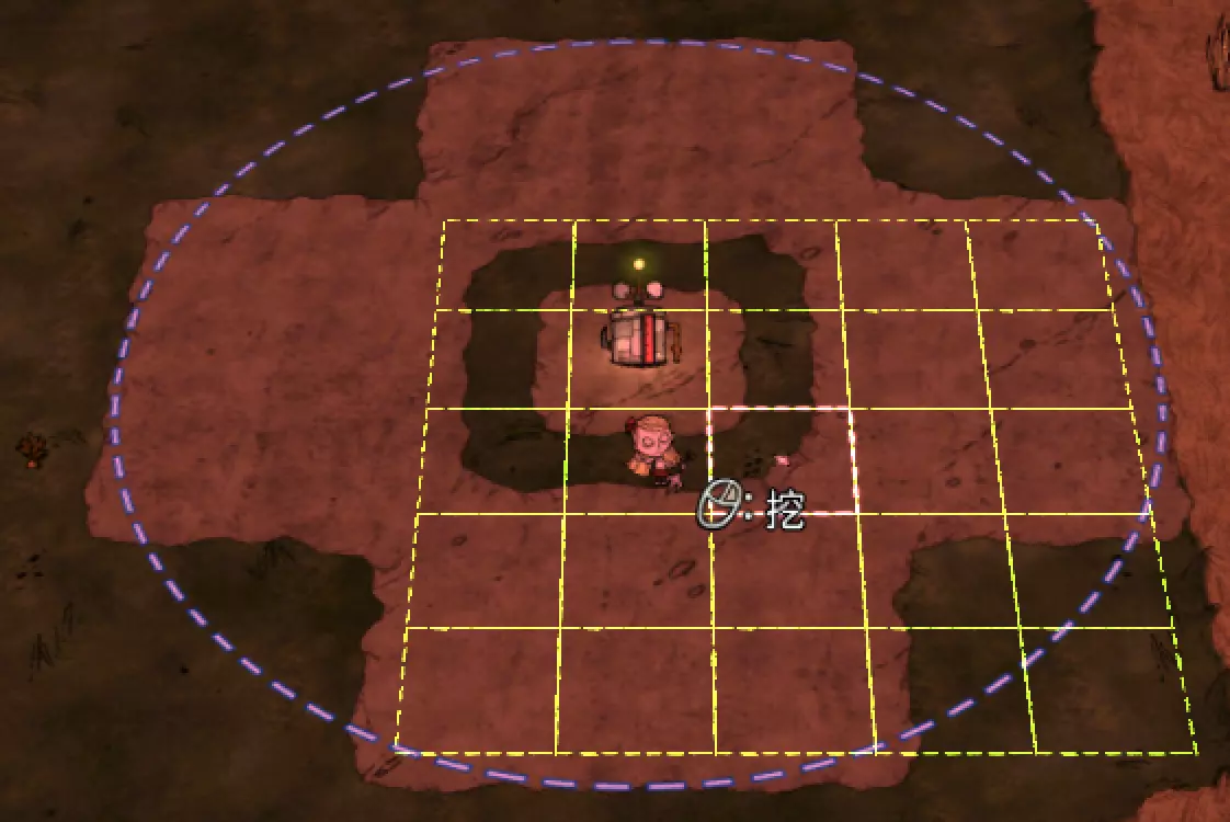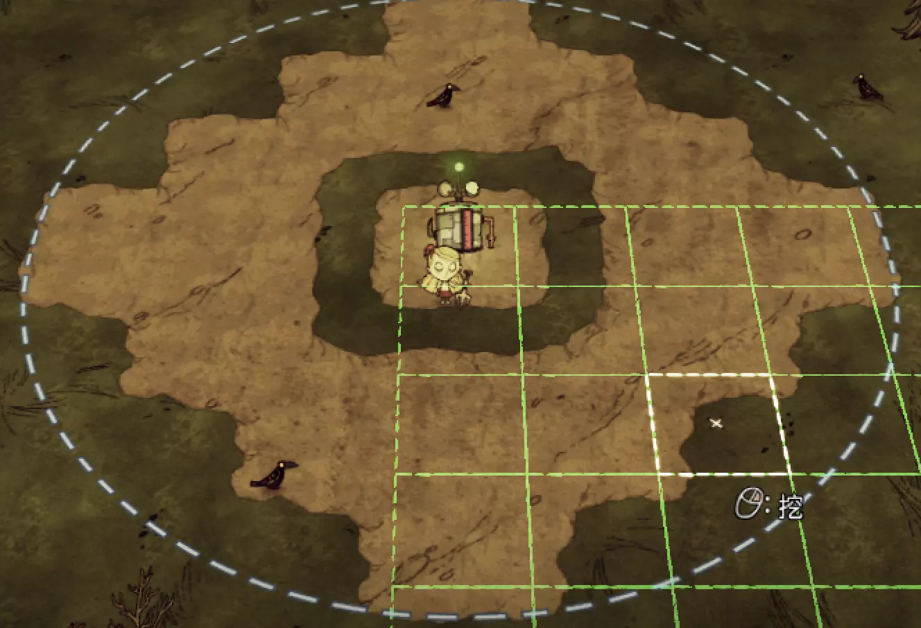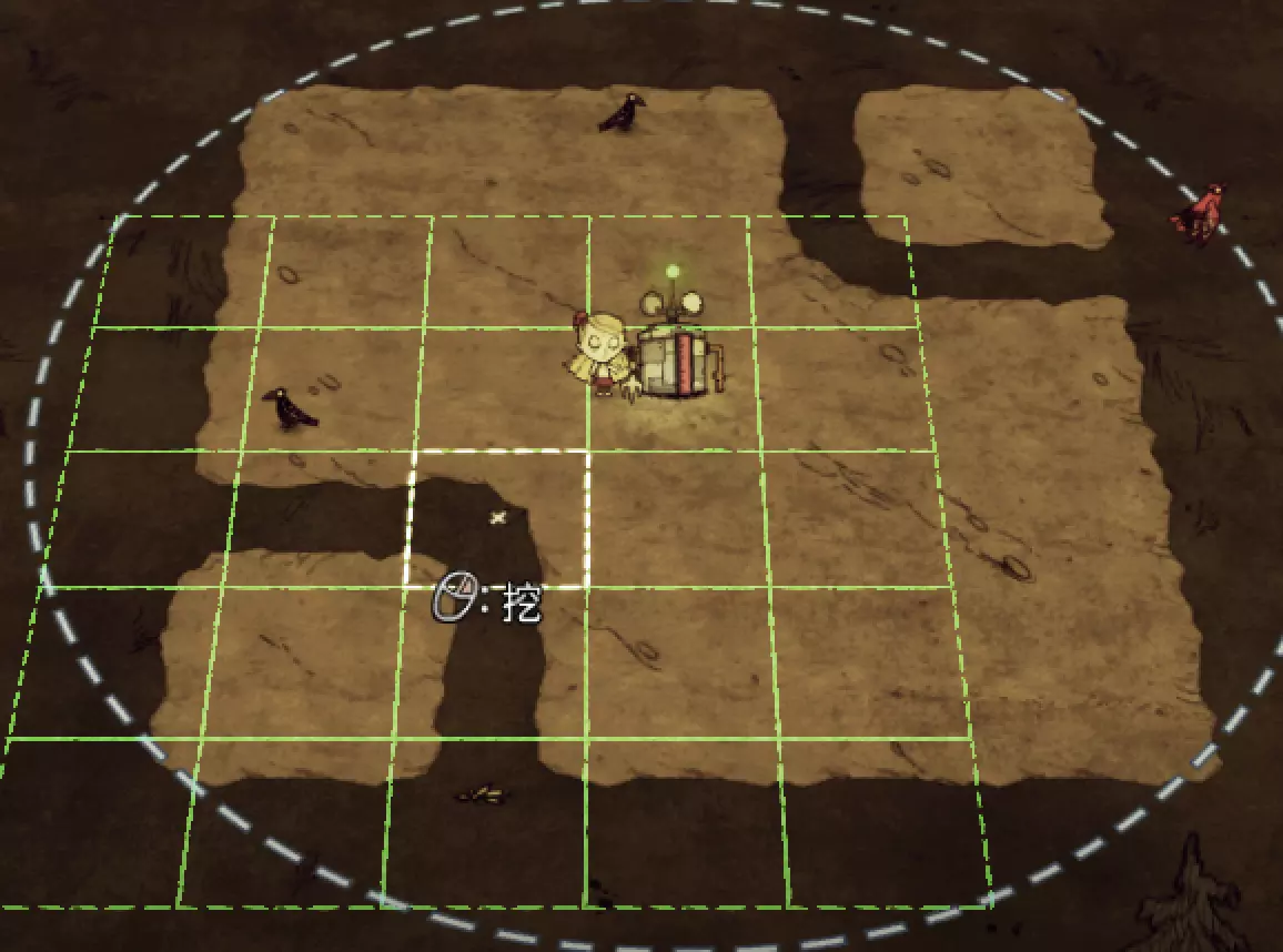 教你如何规划你的基地,想不想成为建家大佬呢,接着往下看吧 前言 这篇文章是讲解一些建家方面的常识技巧,教你如何规划自己的基地,我不会给出成型的豪华基地,那样只会限制想象空间,让我们创造出属于我们自己的基地吧! 我们建造的基地要遵循便利,实用,合理等原则 便利:我们在工作或吃饭的时候不需跑很长的路,比如锅和冰箱,吃个饭如果要跑一个屏幕的话,只怕早饿死了。实用:基地成型快,需循序渐进。比如我特别喜欢烹饪,建了15个锅的基地,结果建家时把锅都摆上了,却发现没石头做农场,最后锅是有了,食物却没了= = 合理:基地建筑的摆放要合理。夏天有自燃现象,需要灭火器,要规划好建筑位置,确保它们都在灭火器的有效范围内,但灭火器对火坑可不太友好! 先了解一个格子: 建家当然少不了干草叉,干草叉将《饥荒》世界分成了一个一个的小格子。但要想把基地建得整齐,只有干草叉是不够的(难道让我一个格子种一根草吗OvO),还需要网格种植mod,该mod能将每个格子分成更密的点。 怎么找格子的边角: 中间的叉是格子的中心。