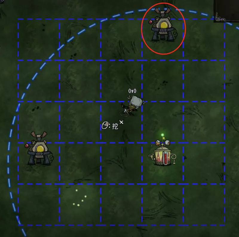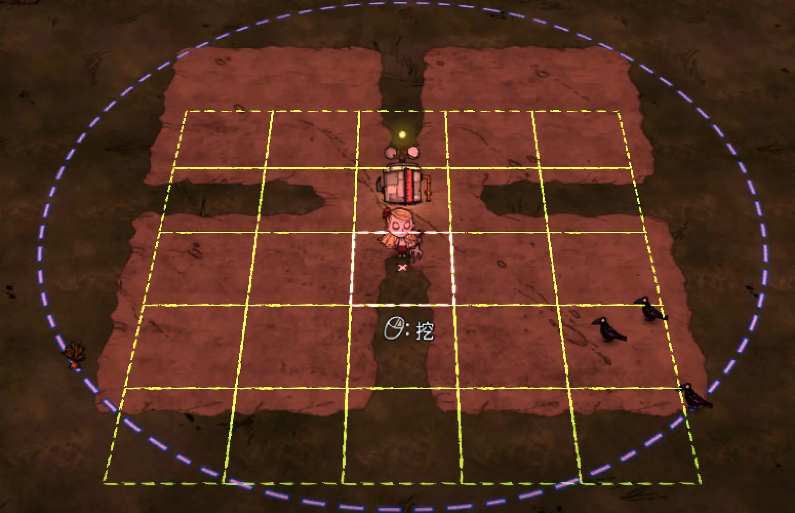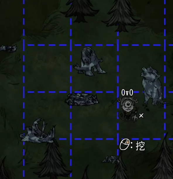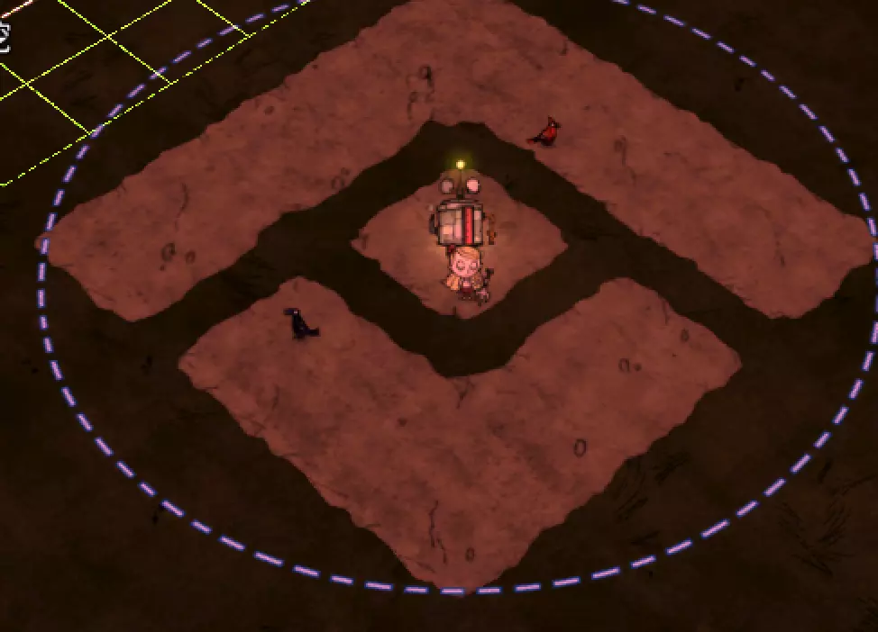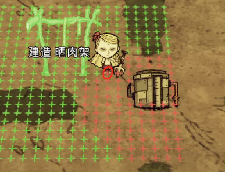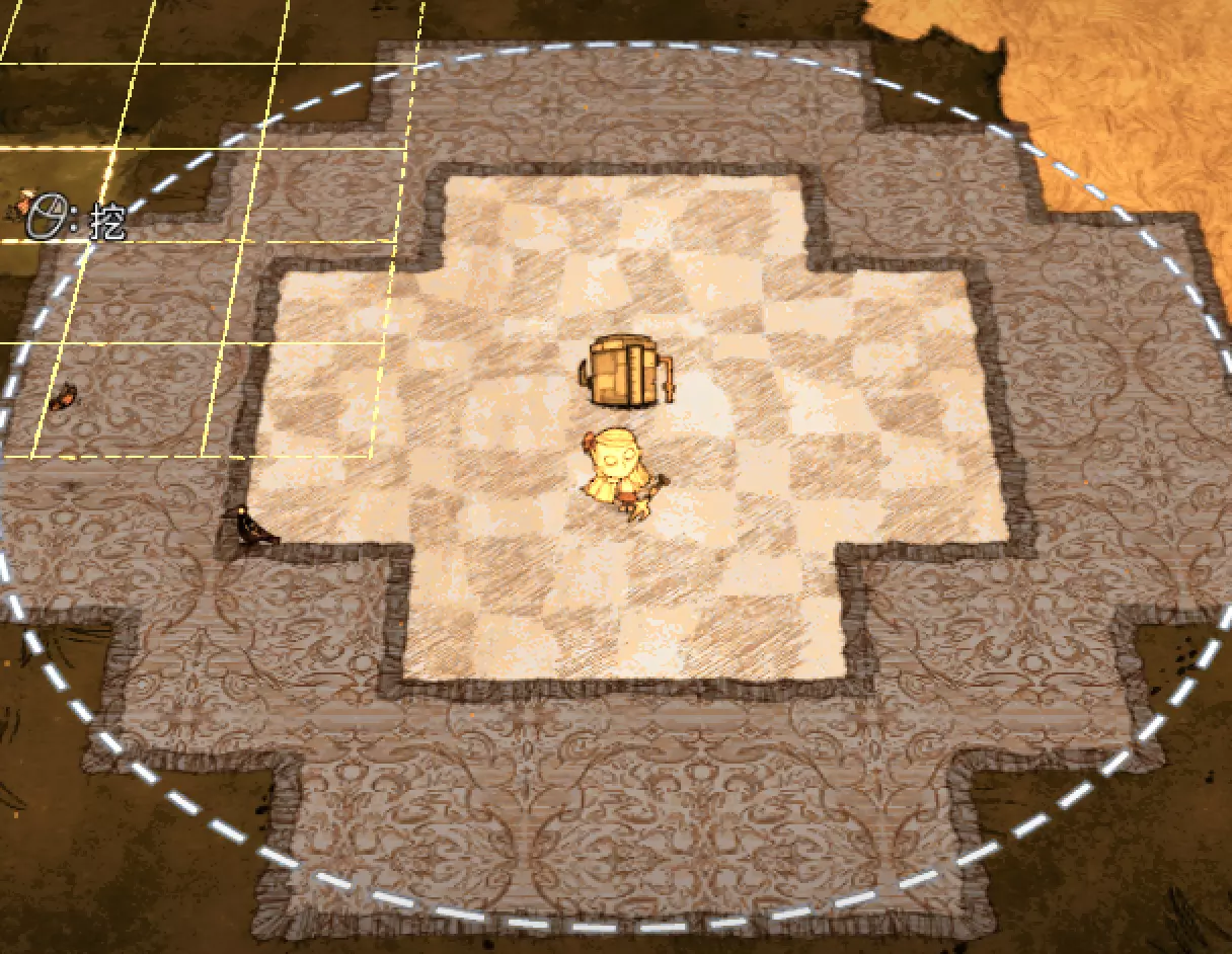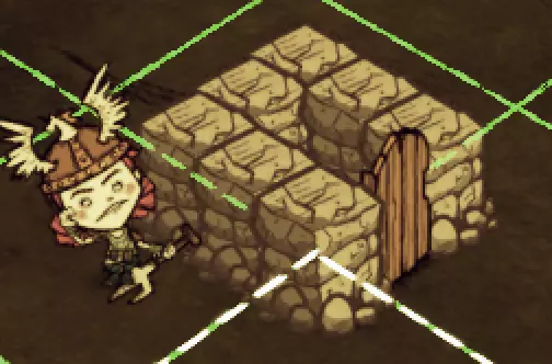 教你如何规划你的基地,想不想成为建家大佬呢,接着往下看吧 前言 这篇文章是讲解一些建家方面的常识技巧,教你如何规划自己的基地,我不会给出成型的豪华基地,那样只会限制想象空间,让我们创造出属于我们自己的基地吧! 我们建造的基地要遵循便利,实用,合理等原则 便利:我们在工作或吃饭的时候不需跑很长的路,比如锅和冰箱,吃个饭如果要跑一个屏幕的话,只怕早饿死了。实用:基地成型快,需循序渐进。比如我特别喜欢烹饪,建了15个锅的基地,结果建家时把锅都摆上了,却发现没石头做农场,最后锅是有了,食物却没了= = 合理:基地建筑的摆放要合理。夏天有自燃现象,需要灭火器,要规划好建筑位置,确保它们都在灭火器的有效范围内,但灭火器对火坑可不太友好! 先了解一个格子: 建家当然少不了干草叉,干草叉将《饥荒》世界分成了一个一个的小格子。但要想把基地建得整齐,只有干草叉是不够的(难道让我一个格子种一根草吗OvO),还需要网格种植mod,该mod能将每个格子分成更密的点。 怎么找格子的边角: 中间的叉是格子的中心。