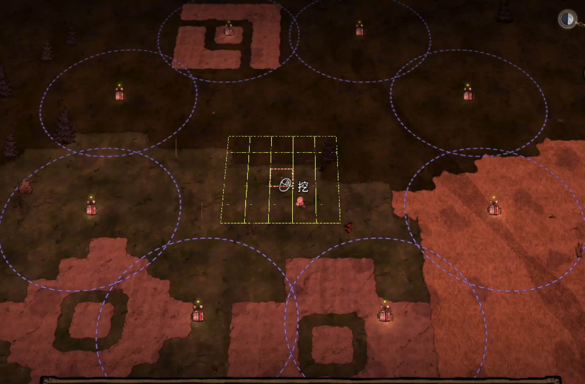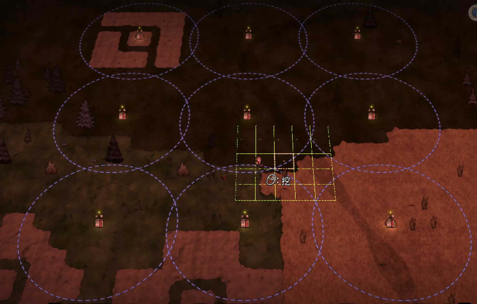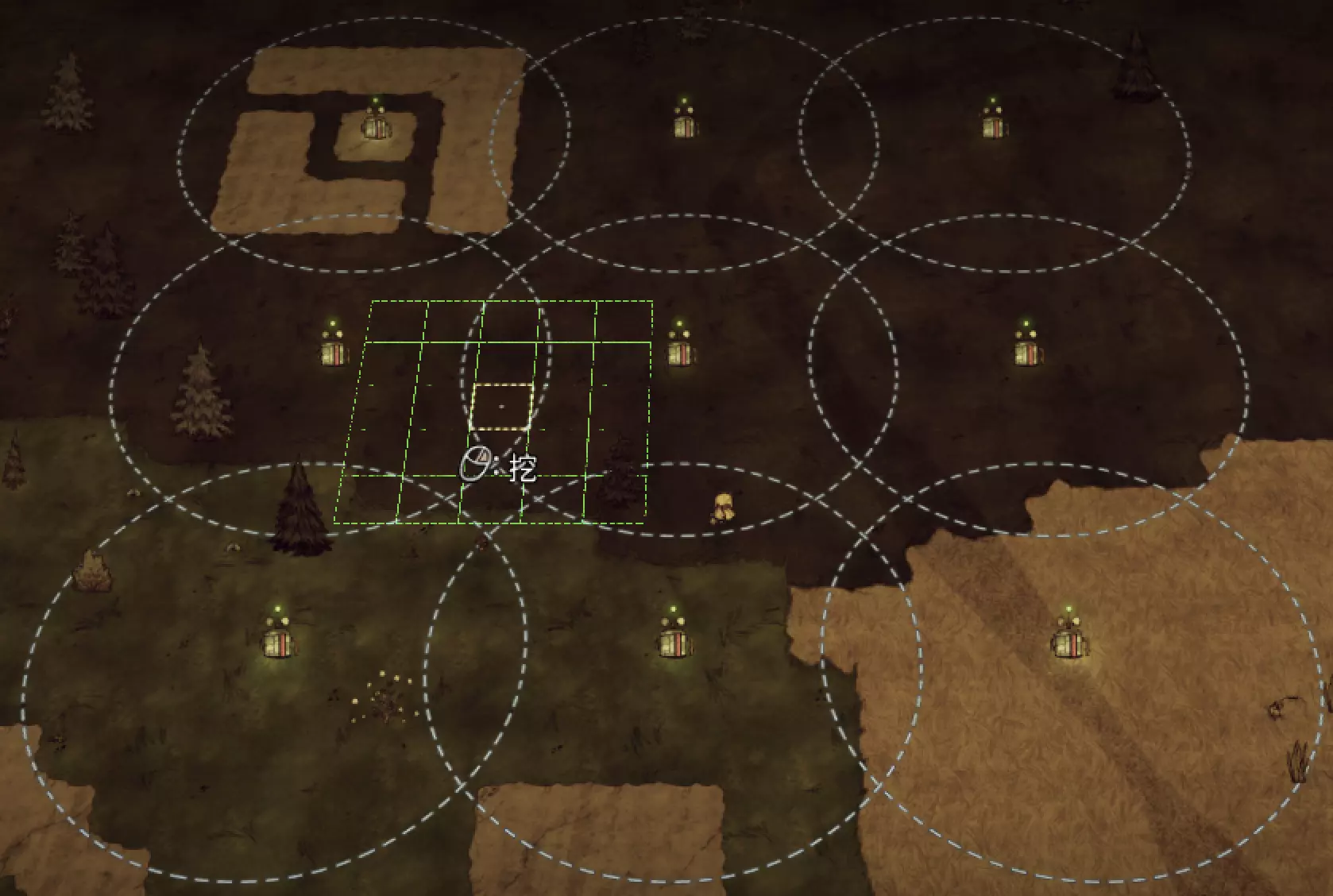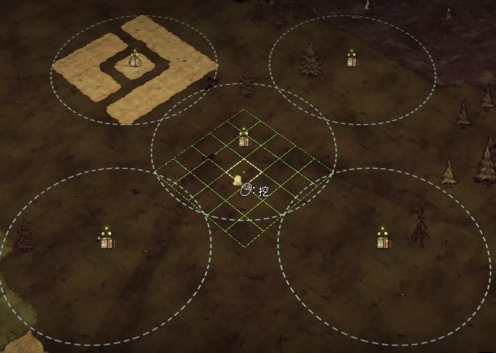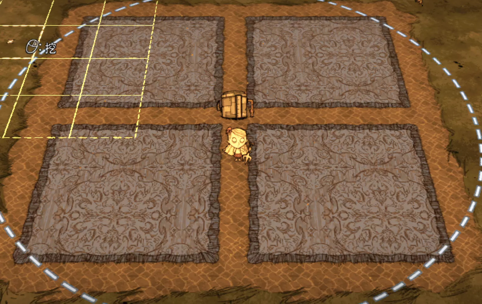 教你如何规划你的基地,想不想成为建家大佬呢,接着往下看吧 前言 这篇文章是讲解一些建家方面的常识技巧,教你如何规划自己的基地,我不会给出成型的豪华基地,那样只会限制想象空间,让我们创造出属于我们自己的基地吧! 我们建造的基地要遵循便利,实用,合理等原则 便利:我们在工作或吃饭的时候不需跑很长的路,比如锅和冰箱,吃个饭如果要跑一个屏幕的话,只怕早饿死了。实用:基地成型快,需循序渐进。比如我特别喜欢烹饪,建了15个锅的基地,结果建家时把锅都摆上了,却发现没石头做农场,最后锅是有了,食物却没了= = 合理:基地建筑的摆放要合理。夏天有自燃现象,需要灭火器,要规划好建筑位置,确保它们都在灭火器的有效范围内,但灭火器对火坑可不太友好! 先了解一个格子: 建家当然少不了干草叉,干草叉将《饥荒》世界分成了一个一个的小格子。但要想把基地建得整齐,只有干草叉是不够的(难道让我一个格子种一根草吗OvO),还需要网格种植mod,该mod能将每个格子分成更密的点。 怎么找格子的边角: 中间的叉是格子的中心。