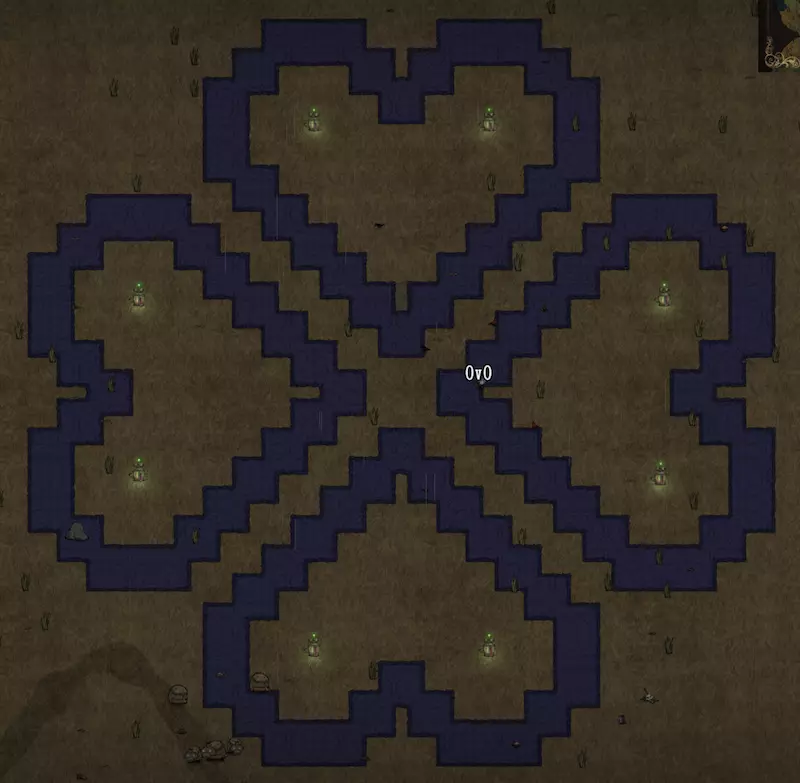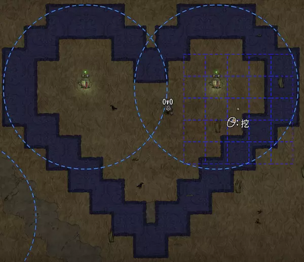 补充说明,没有参照物也能轻松建造,只需记住A、B两点的位置关系,它们都位于相邻建筑斜边第四与第五点的中间。 不规则建家: 这种建家方式主要沿着地图边界进行建造,与地形关联很大。通过围墙与建筑的结合,风格多样且美观,充满荒野生存的气息,墙体通常以木墙为主。 //四叶草基地// 四叶草是心形的组合,心形在前面已提及,这里进行详细说明: 首先制作一个心形,需要确定好两个圆心(如下图所示),两点之间的距离为6个格子。