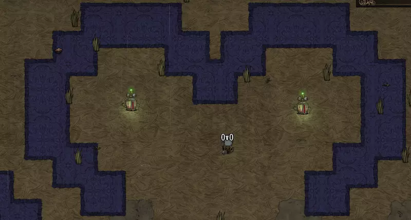 这大概是建家选址最多的一个地形,月台位于森林中,旁边一定会刷新一个海象。 最大的优势是**永恒的大范围光源和降温**,只需要将月杖插在上面即可,并且**每次月圆可以刷大量的肉和猪皮**。 缺陷是**交通不便利**,如果附近没有好的虫洞需要花很长的时间跑腿,而且**月台的位置并不是规整地在格子的中间或角落**,如果为了美观需要调整基地的布局。 猪王