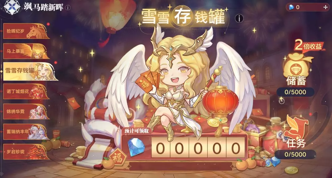 ○ 活动开启指定天数内,通过储蓄存入钻石(最多可储蓄5000钻石),存钱罐可领取时,将返还双倍钻石;