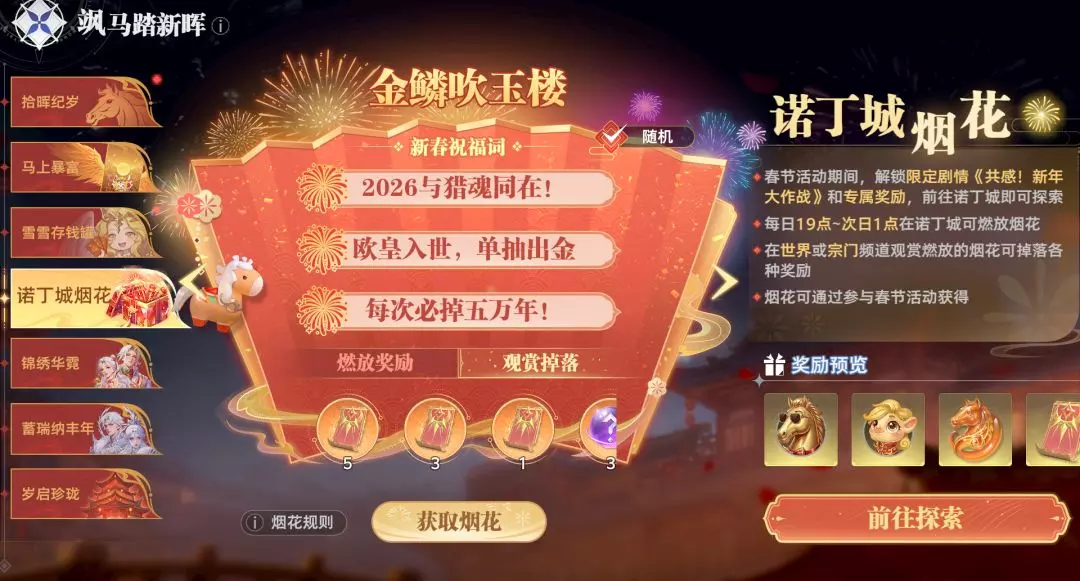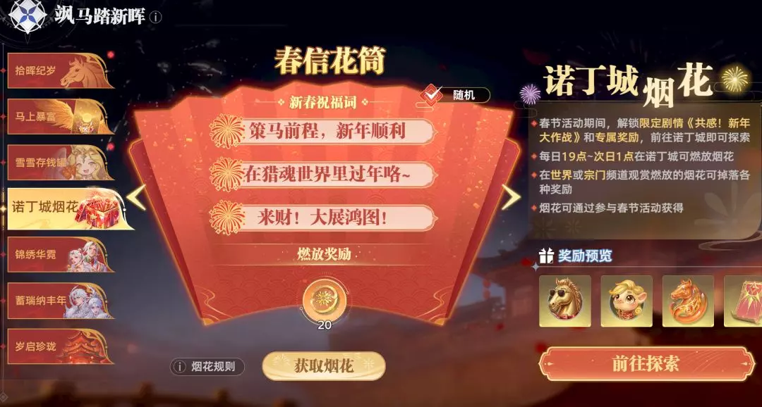 ○ 活动期间,每日指定时间段可在诺丁城烟花广场燃放烟花,燃放可获得燃放奖励,同时自动发送新春祝福词弹幕;