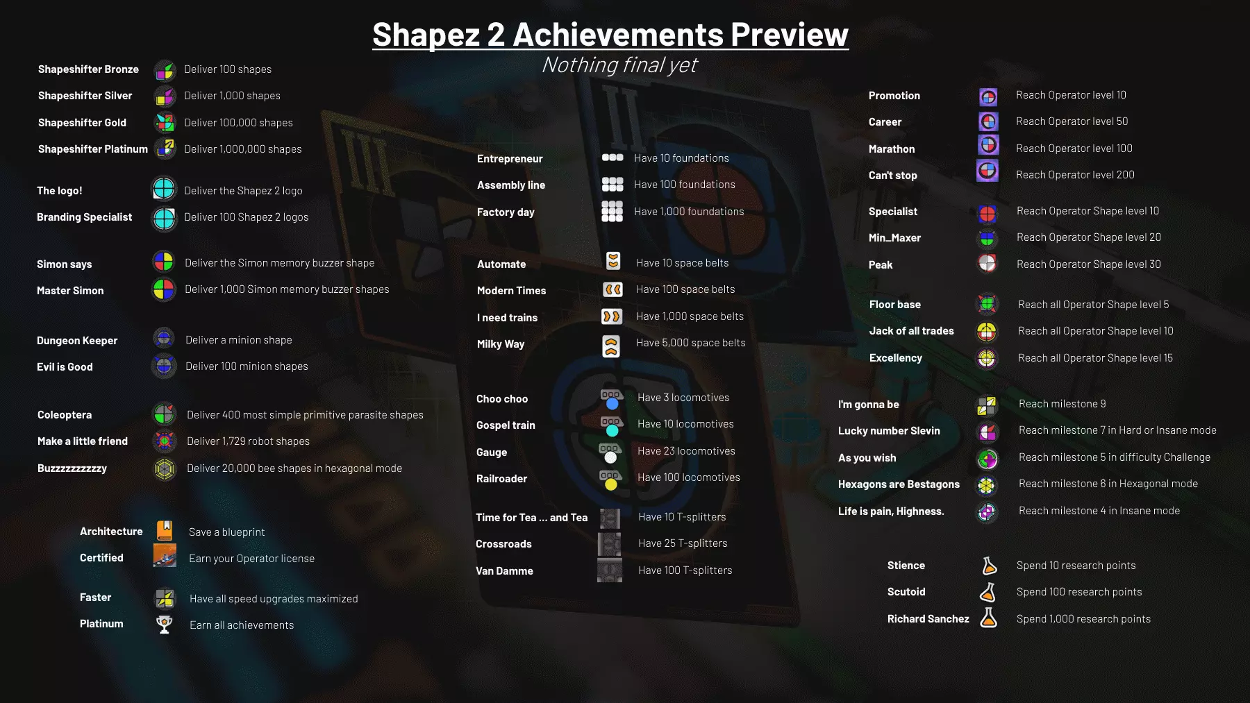 大家好! 由于我们目前正全力投入游戏1.0版本的更新工作,所以这段时间比往常更为安静! 我必须承认,由于工作量巨大,我没能抽出足够时间来保持开发日志的定期更新。不过,我有一些想法或许能极大改善这一情况,这部分内容将留到下一篇开发日志中分享。 无论如何,我想向大家同步一下目前的进展情况以及1.0版本的预期内容! ### 我们当前的计划 目前,团队正以120%的精力专注于《形状工厂2》的1.0版本发布。我们的进展非常顺利,因此我有信心能在不久之后为大家带来更多相关更新!1.0版本,尤其是新增的游戏模式,其规模远超我们最初的规划,这也是它比预期花费更长时间的原因。本次开发日志中包含以下部分改进内容: 1.0版本发布后,《Shapez 2》将进入“持续运营”模式,我们会提供定期更新,并计划推出一些DLC——首个DLC将是《Shapez 2》的解谜DLC改编版(不过这次会内置更多谜题——再次为此表示歉意!)。 与此同时,我们也在构思未来可能的新项目,一款全新的工厂游戏,它将比《Shapez 2》更具象化,也更具野心。因此,公司将分为两个团队——一个团队负责《Shapez 2》的开发,另一个团队负责这个新项目的原型制作。这就引出了下一点: 我们正在招聘!我们目前正在招聘3个新职位,未来还会有更多——如果你想加入我们(为什么不呢!对吧?),这就是你的机会! 游戏设计师:https://8bitplay.com/jobs/game-designer/ 执行制作人:https://8bitplay.com/jobs/executive-producer/ 高级技术美术师:https://8bitplay.com/jobs/senior-technical-artist/ 即使这些职位不适合你,如果你有兴趣,建议关注我们公司的LinkedIn页面,以便在新职位出现时收到通知! 1.0版本进度更新 ① **制造模式** 现称“制造模式”的开发进展顺利,我们已经开始与赞助者进行非常早期的测试。不过目前仍存在许多问题,尚未完全可玩。一旦我们取得更多进展,就会逐步推进封闭测试,随后在Steam上推出测试分支。 制造模式的关键变化是引入了“转换器”,它需要特定的形状作为输入,并能产出无法直接制造的其他形状。 我们计划专门发布一篇开发日志详细介绍制造模式,因此这里就不展开细说了。 不过,至少我可以透露一些小剧透: