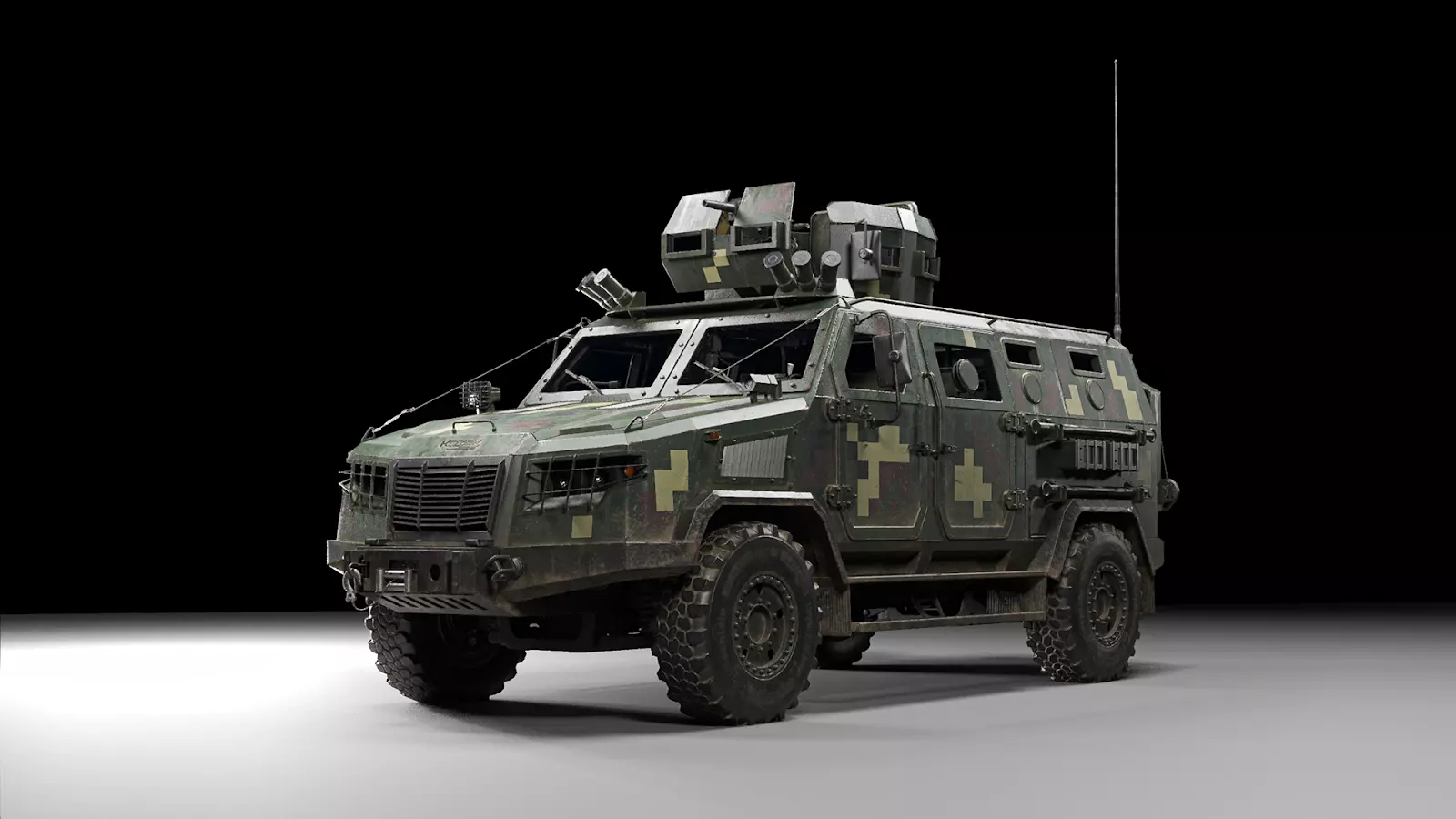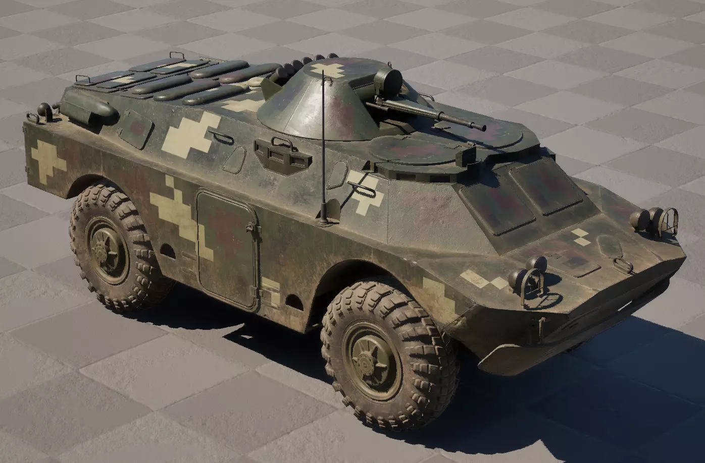 BRDM-2M1封闭式装甲侦察车 BRDM-2M1是乌克兰在著名侦察车基础上自主生产的改进型号。乌克兰武装部队(AFU)所使用的该型号在车体方面存在一些细微差异(如不同的舱门位置),并且取消了标志性的腹轮,这使得车内能够额外增加几个座位:1名驾驶员、1名炮手以及最多6名乘客。请注意,此载具拥有完全建模的内部结构。