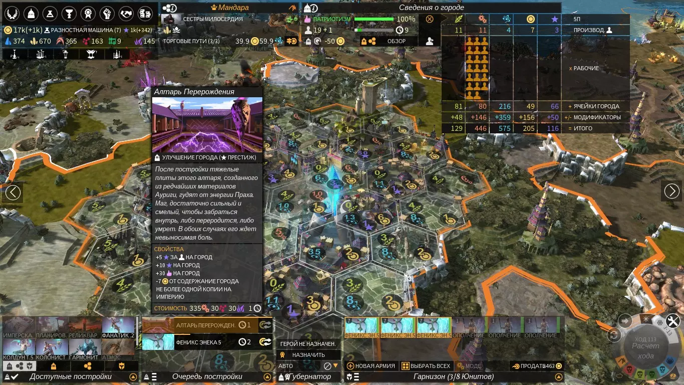 研究应从世界语言广场开始,然后根据您城市的需求进行。第一项科技是完成派系任务的关键,无论未来游戏如何发展,都需要着手进行。如果我们运气好,区域内有泰坦矿石和钢化玻璃,那么从一开始就要研究炼金炉:我们将需要这些资源来建造升级建筑以及第一和第二座传奇建筑。第一座建筑是创始人纪念碑,接下来建议建造铸造厂。我们将快速研发科技,这意味着能够建造更多建筑。因此,在游戏初期阶段,生产是我们城市的关键属性。 从第一步开始就建造进步祭坛,如果运气好获得灰烬,那就再建造一个。祭坛建造有一个特点——后续每个祭坛的建造费用会逐渐增加。因此,如果你有足够的灵魂尘埃建造另一个祭坛,但已建造的祭坛只剩下最后一次使用次数,那么最好等待一下,之后再建造两个祭坛。为了保证正常的游戏节奏,第一个祭坛的费用为40灵魂尘埃,第二个为105灵魂尘埃,这样下一轮总共只需花费145灵魂尘埃,而不是一次性建造两个所需的210灵魂尘埃。一旦研究完成该科技,即可开始执行阵营任务。我们需要与两个村庄进行谈判。谈判结束后,需派遣军队勘察首都附近的遗迹。我们将获得2个无法升级的单位,但它们会在游戏初期提供帮助。新出现的单位可能是泰尔瑟姆巫师或阿泰希狂热者。后续的任务流程包括寻找遗迹以及与中立单位战斗,因此请保持部队集中。在任务初始阶段的末尾,我们将获得英雄武器——超凡维迪法杖,装备该武器需要28点超维值。这件武器是游戏中辅助型英雄的最佳选择,所以从游戏初期就可以开始在市场上积攒超维值粉尘了。任务的下一部分是在你的帝国中拥有五座已被征服的村庄,这部分任务将在进一步扩张后解锁。 在规划扩张时,我们需要选定一个后续要殖民的区域。在该区域建立城市时,每格地块必须产出10点进度值,也就是说,最好该区域存在进度异常点,或者这座城市将建在冰原地区。要继续进行派系任务,需要至少拥有4个区域:其中3个区域各需包含5座村庄,此外还需一个专门的区域来建造“维尔德神殿”。该神殿是一种独特建筑,需在任务城镇中建造,其功能类似于几何实验室。在小型地图上不一定能实现这样的扩张,但在中型和大型地图上则需要这样做,以获取冬季祭坛。冬季祭坛能使冬季的尘埃、进度或食物产量增加3,声望增加1,且不受祭坛等级影响。 中后期通用策略