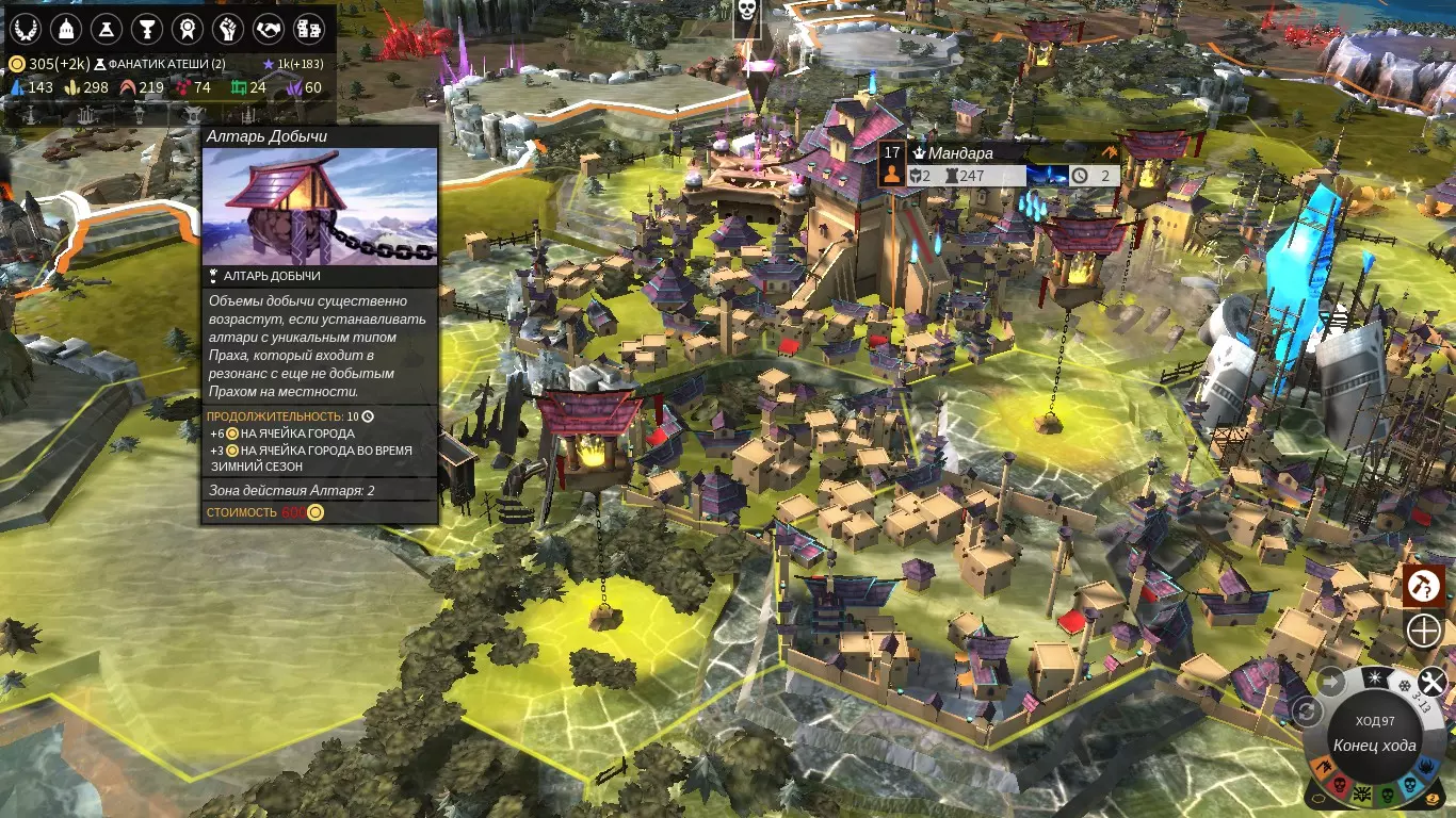 Застройка магов очень необычна. Это связано с тем, что нужно постоянно держать активные алтари. Для наибольшей эффективности алтарь должен располагаться в кольце из районов: в таком случае алтари 1-2 уровня будут покрывать 7 клеток районов и разработок, а алтари 3-5 уровней будут покрывать 19 клеток. По это причине для города должно быть много места, а в самом городе высокий уровень довольства, так как районы 1 уровня дают штраф к довольству. Строительство легендарных зданий позволит сократить необходимую численность населения для строительства такой необычной планировки. И последнее. Многие считают Алтари скорости бесполезными. Однако на пятом уровне улучшения алтаря, радиус действия становится 4 клетки, а уменьшение необходимых очков на -75%. Построив несколько таких алтарей можно преодолеть огромные расстояния, за один - два хода. Для магов дополнение Shadows дало второе дыхание для алтаря скорости - просветка вражеского города с целью посадить туда шпиона, однако это всё ещё остаётся слишком высокой и почти бесполезной тратой праха. (Но вы только представьте, что 10 ходов у соперника будет смятение по поводу того есть ли в городе шпион или нет, так что ему придётся жертвовать производством для поиска шпионов.) Особые тактики игры (Ранний раш) Ранний раш за магов Эта тактика подходит для малых и больших карт, когда ваш противник находится с вами в соседнем регионе, или через регион. Раш - быстрая атака, обычно проводится в стелс режиме, без предварительного предупреждения. Основной элемент - внезапность и численный перевес. Производится только в первую эру, однако возможно нападение на противника, если мы вошли во вторую эру намного раньше и сможем позволить себе строительство и улучшение юнитов экипированных вторым железом. Основные этапы: Закладывание города. Смотрим на максимальные показатели пищи и производства. Это будет важно для быстрого создания армии. Город должен быть построен в пределах пути одного хода от стартовой позиции. Как только поставили город - строим монумент и ставим один или два алтаря на прогресс. Изучение технологий. Площадь языков мира > Литейный цех, далее по ситуации. Первая технология будет изучена через 1-2 хода на быстрой скорости игры. За это время наши юниты дойдут до деревень малых фракций чтобы провести переговоры. Войска. С самого старта отделяем по очереди колдунов и отправляем в разные стороны, желательно в ближайшим регионам. Герой с колонистом заложат город, после чего герой будет свободно разведывать. Колдунов одеваем в броню. На это хватит денег, только если мы найдём прах в руинах. Стартовый прах тратится на алтари. После переговоров ближайший к городу юнит должен осмотреть руины возле города, для того чтобы получить 2 юнита неистовых магов. Здесь возможны 2 варианта: 2 колдуна или 2 фанатика. Вариант с фанатиками более благоприятный, ведь стартовые колдуны безумно хилые. В городе после литейного цеха строится первый колдун. А армия из четырёх юнитов направляется к городу соседа. Первым планом империи берётся военная ветвь. Войска продолжаем строить до тех пор, пока сосед не будет уничтожен. Особенности экипировки колдунов против разных соседей: Кланы, культисты - копьё и броня, без каких либо колец. Хранители, ходоки - копьё, броня и кольцо для защиты от дальнобойных атак. Некрофаги, владыки пра