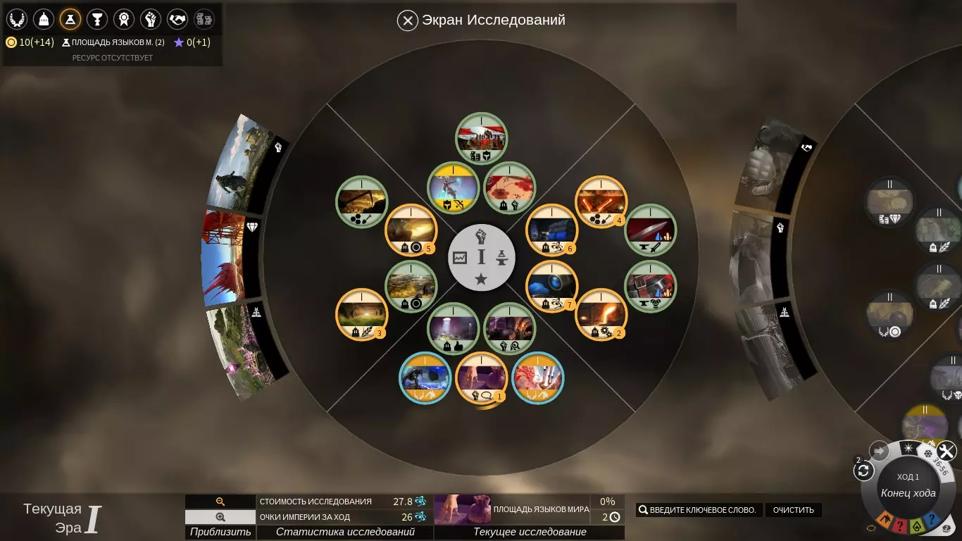 我也想在这篇评测中再加入一位辅助英雄,但这次是来自另一阵营的——龙族英雄。作为指挥官,该英雄凭借被动技能能大幅提升部队的生命值上限,其职业技能还能额外增加30%的生命值。法师战士的生命值越高,就越难被击杀,并且每损失一点生命值,他们的攻击力就越强。德拉克诺夫英雄拥有治疗法术,该法术对法师战士具有双重作用——一方面治疗可以让战士避免死亡,另一方面会因体内火焰而降低其攻击力。 此外还有邪教徒和食尸者英雄,他们能提升军队的生命值和防御力,但在本次评测中暂不讨论这些英雄,因为我们的阵营任务关注的是辅助型英雄。关于用于同化的部队,我就不展开细说了,因为它们具有情境性,会根据帝国的需求来选择,毕竟法师们很容易就能找到通往胜利的任何途径。 帝国的科技与计划 得益于游戏初期就能使用的知识祭坛,法师们从第一步开始就能在发展和研究方面迅速取得领先。如果能幸运地从废墟中获得尘埃,那么从第一步开始就能立即建造2个祭坛。科技 对于法师的科技而言,有非常多的发展路径。这完全取决于地图、敌人以及你偏好的胜利风格。你需要根据自己派系中更有利的方向来研究科技。祭坛在第一纪元期间能让你获得研究科技的机会,这些科技将有助于发展第一个城市,但到了第二纪元,它们带来的增益就太小了。在第三纪元,进度获取量从2提升至5,同时新增了获取祭坛灰烬的途径。但进度、食物和灰烬的最大提升将在第五纪元到来——收益从5增加到6,不过祭坛的覆盖范围变为总共19格。 由于这一特性,法师们可以研究任何所需的科技。然而,若你想进入第六时代,就需要立即研究所有关键科技,因为在研究完第45项科技后,就只能研究第六时代的项目了:每研发一项新技术,研究成本都会增加1.5倍,这将是非常巨大的进度消耗。 帝国规划 在帝国规划中,需要坚持“进度”和“生产”路线。从游戏一开始就需要在该方向至少保持一级。 经济和人口分支的收益非常低,除了第一级(冬季有时需要让人口去生产木炭,因此第一级会有用)。 关于军队分支也说几句。当城市的生产力较高时,可以招募军队并在雇佣兵市场上出售。该发展方向的第一级将通过这种方式加快尘埃的收集速度。 帝国与扩张分支对我们而言至关重要,这得益于其第二级的效果。由于城市布局较为特殊(稍后会详细说明),民众满意度将会大幅下降。因此,第二级带来的满意度提升将有助于避免城市生产力下降。 初期游戏的总体策略