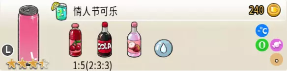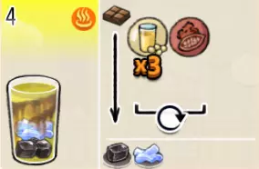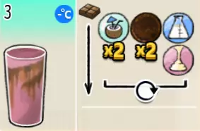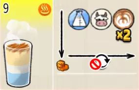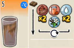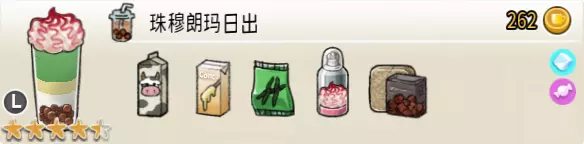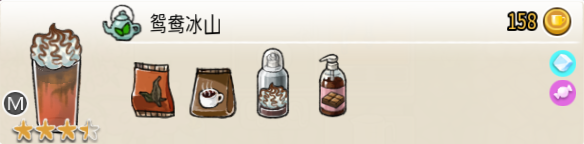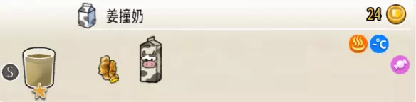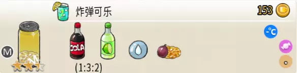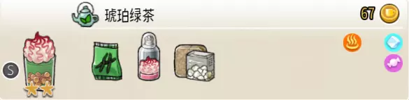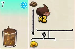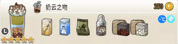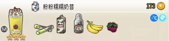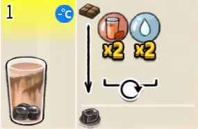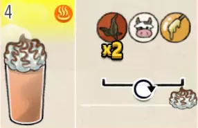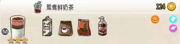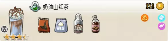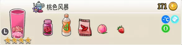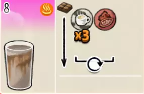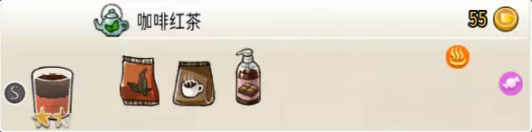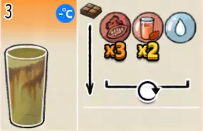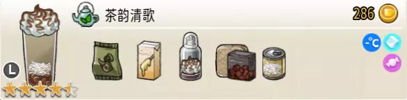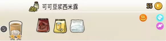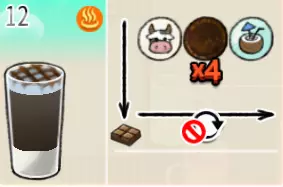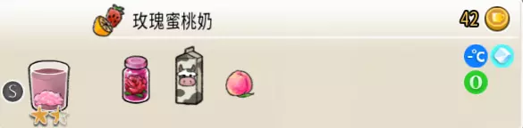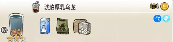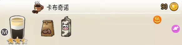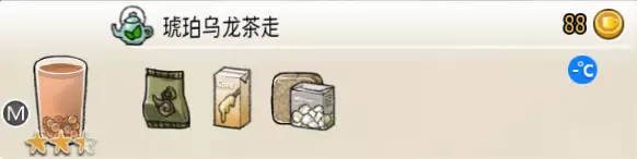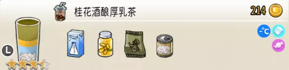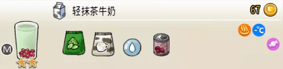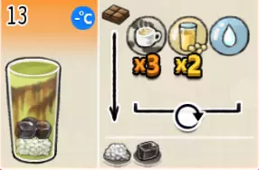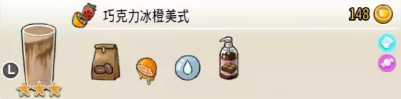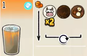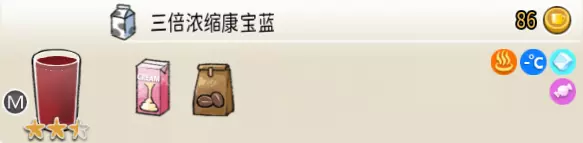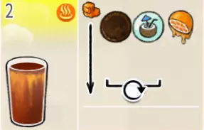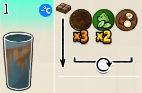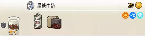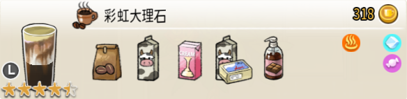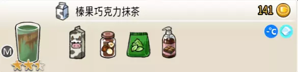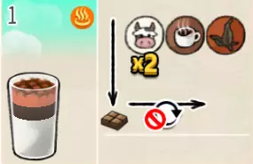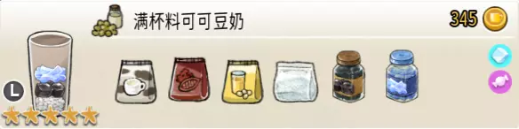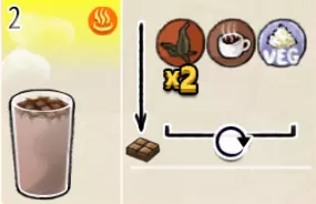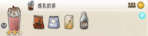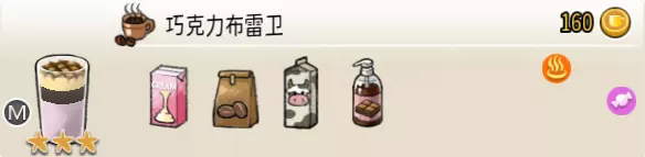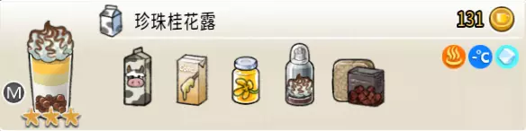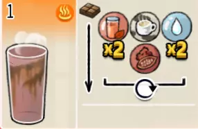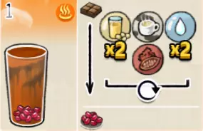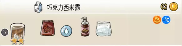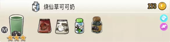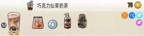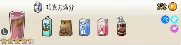 热可可牛奶(中杯) 出售原价:153 状态:加热,无糖/加糖 配方:巧克力酱×1(挂壁,最先制作),速溶牛奶×3+可可×1,搅拌 等级:2.5星