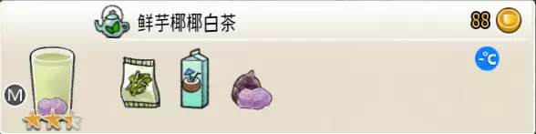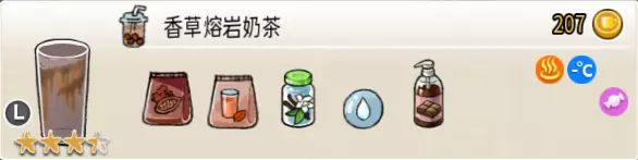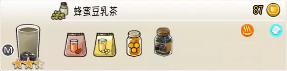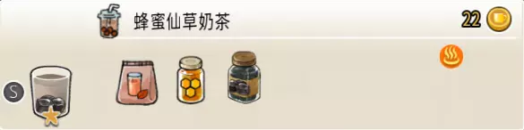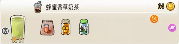 蜂蜜香草奶茶(中杯) 出售原价:64 状态:加热,无糖/加糖 配方:速溶奶茶×2+蜂蜜×1+香草糖浆×1,搅拌 等级:1.5星