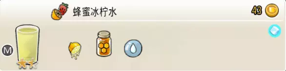 蜂蜜冰柠水(中杯) 出售原价:43 状态:加冰,无糖 配方:鲜柠檬×1+蜂蜜×1+水×2,搅拌 等级:1.5星