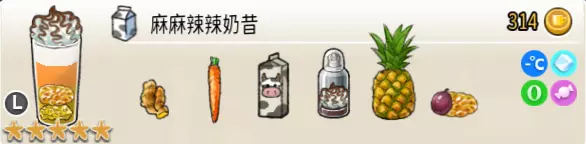 麻麻辣辣奶昔(大杯) 出售原价:314 状态:常温/加冰,无糖/加糖/加代糖 配方:凤梨块×1(棒打成酱,最先制作),姜汁×2+胡萝卜汁×2+鲜牛奶×2,百香果×1(小料),可可奶油×1(封顶,最后制作) 等级:5星