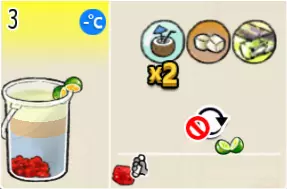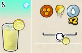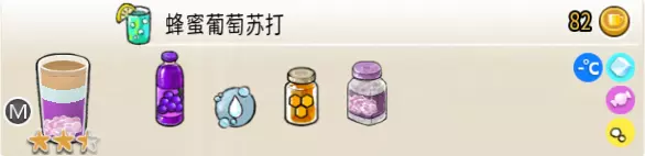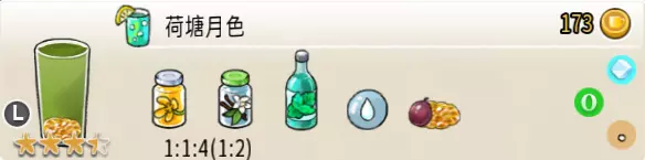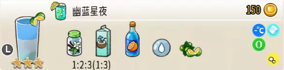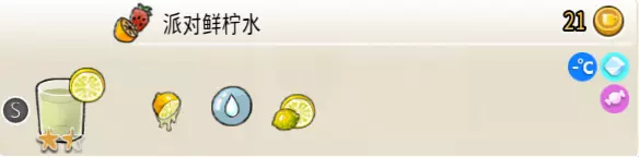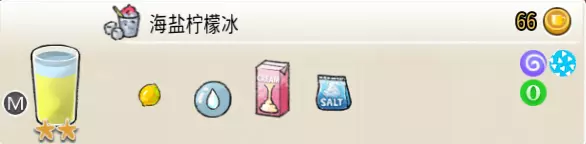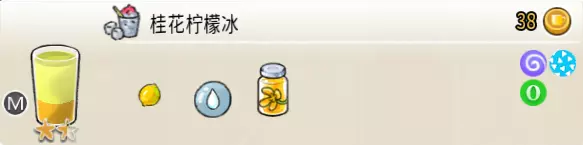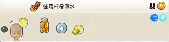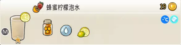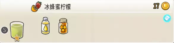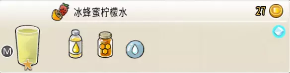 冰蜂蜜柠檬水(中杯) 出售原价:27 状态:加冰,无糖 配方:柠檬汁×1+蜂蜜×1+水×2,搅拌 等级:1星