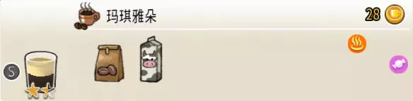 玛琪雅朵(小杯) 出售原价:28 状态:加热,无糖/加糖 配方:咖啡×1+热奶泡×1(按序) 等级:1.5星