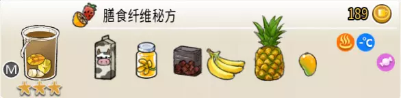 膳食纤维配方(超级杯) 出售原价:189 状态:常温/加热,无糖/加代糖 配方:鲜牛奶×2+桂花糖浆×1+黑糖糖水×1,香蕉块×1+凤梨块×1+芒果块×1(小料),搅拌 等级:3星