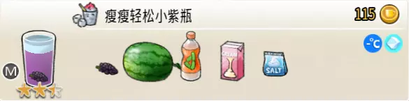 瘦瘦轻松小紫瓶(中杯) 出售原价:115 状态:常温/加冰,无糖/加糖/加代糖 配方:[(西瓜块×1+桑葚×1,破壁)+乳酸菌×1,搅拌]+海燕奶盖×1(最后加入)(按序),桑葚×1(小料) 等级:2.5星