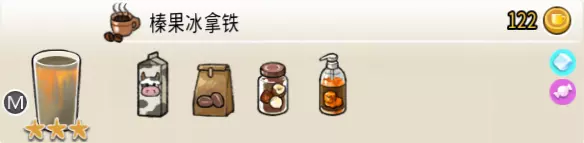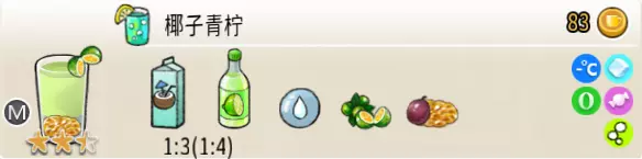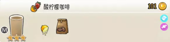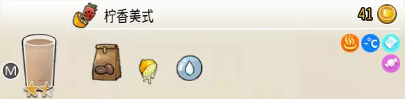 柠香美式(中杯) 出售原价:41 状态:常温/加冰/加热,无糖/加糖 配方:咖啡×1+鲜柠檬×1+水×2,搅拌 等级:1.5星