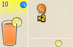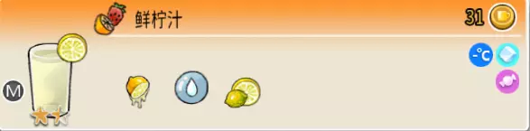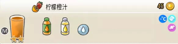 柠檬橙汁(中杯) 出售原价:45 状态:常温/加冰,无糖/加糖 配方:橙汁×2+柠檬汁×1+水×1,搅拌 等级:2星