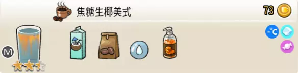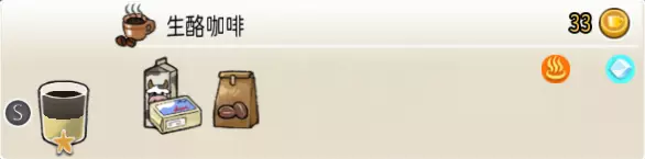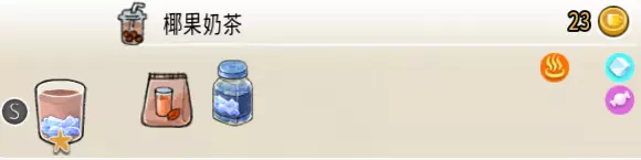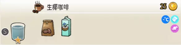 生椰咖啡(小杯) 出售原价:25 状态:常温/加冰,无糖/加糖 配方:咖啡×1+椰汁×1,搅拌 等级:1星