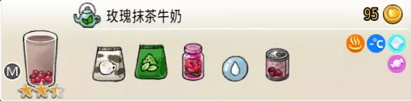 玫瑰抹茶牛奶(中杯) 出售原价:95 状态:常温/加冰/加热,无糖/加糖 配方:速溶抹茶×1+速溶牛奶×1+玫瑰糖浆×1+水×1,红豆×1(小料),搅拌 等级:2.5星