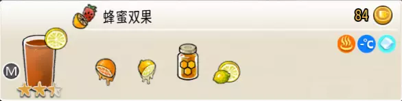 蜂蜜双果(中杯) 出售原价:84 状态:常温/加冰/加热,无糖 配方:鲜橙×1+鲜柠檬×1+蜂蜜×1,鲜柠檬切片×1(装饰),搅拌 等级:2.5星