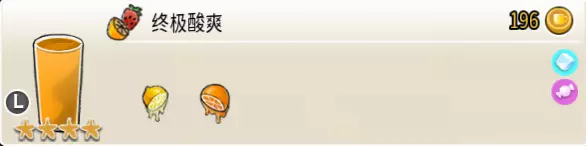 终极酸爽(大杯) 出售原价:196 状态:加冰,无糖/加糖(实际提供常温选项,但菜单中无常温图标) 配方:鲜橙×1+鲜柠檬×4,搅拌 等级:4星