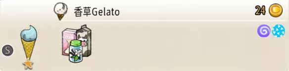 7-4 香草冰淇淋(一层甜筒) 出售原价:24 状态:粗冰激凌/细冰激凌,无酱 配方:原味蛋筒+香草味冰激凌×1 等级:1星