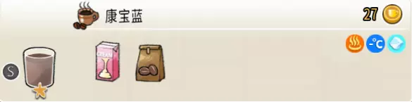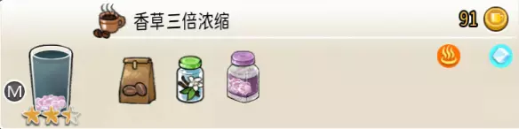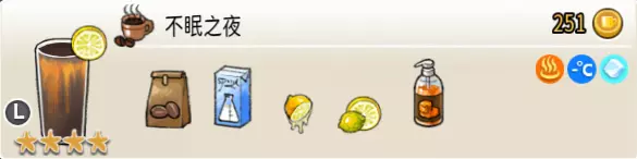 美式香草(中杯) 出售原价:53 状态:常温/加热,无糖 配方:咖啡×2+香草糖浆×1+水×1,搅拌 等级:2星