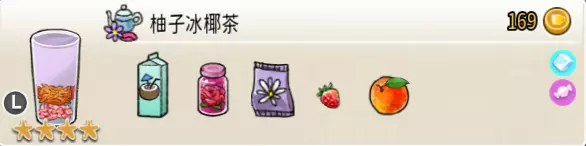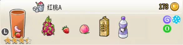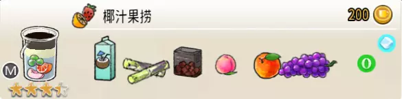 椰汁果捞(超级杯) 出售原价:200 状态:加冰,无糖/加代糖 配方:椰汁×2+甘蔗汁×1+黑糖糖水×1(无序),桃子块×1+西柚块×1+葡萄块×1(小料) 等级:3.5星