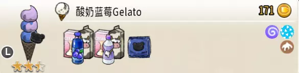酸奶蓝莓冰淇淋(三层甜筒) 出售原价:171 状态:粗冰激凌/细冰激凌,无酱/加酱 配方:芝麻蛋筒+蓝莓味冰激凌×1+(酸奶味冰激凌+蓝莓味冰激凌,双色)×1+酸奶味冰激凌×1(按序),黑曲奇×1(装饰) 等级:2.5星