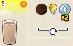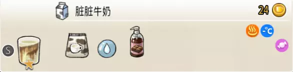 2-3 脏脏牛奶(小杯) 出售原价:24 状态:常温/加热,无糖/加糖 配方:巧克力酱×1(挂壁,最先制作),速溶牛奶×1+水×1,搅拌 等级:1星