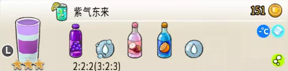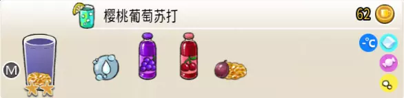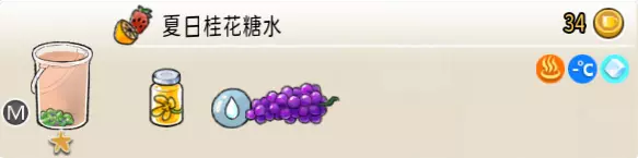 6-4 夏日桂花糖水(超级杯) 出售原价:34 状态:常温/加冰/加热,无糖 配方:葡萄块×1(棒打成酱,最先制作),桂花糖浆×1+水×3,搅拌 等级:1星
