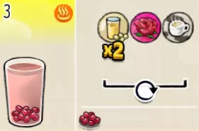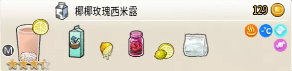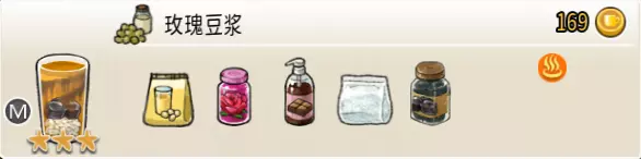 玫瑰豆浆(中杯) 出售原价:169 状态:加热,无糖 配方:巧克力酱×1(挂壁,最先制作),速溶豆浆×1+玫瑰糖浆×3,西米×1(小料,需煮制),搅拌 等级:3星