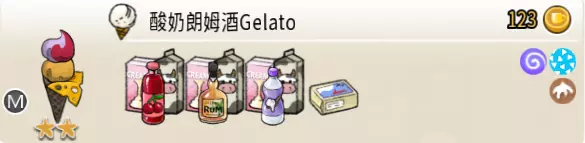 酸奶朗姆酒冰淇淋(二层甜筒) 出售原价:123 状态:粗冰激凌/细冰激凌,无酱/加酱 配方:芝麻蛋筒+朗姆酒味冰激凌×1+(酸奶味冰激凌+樱桃味冰激凌,双色)×1(按序),芝士切片×1(装饰) 等级:2星